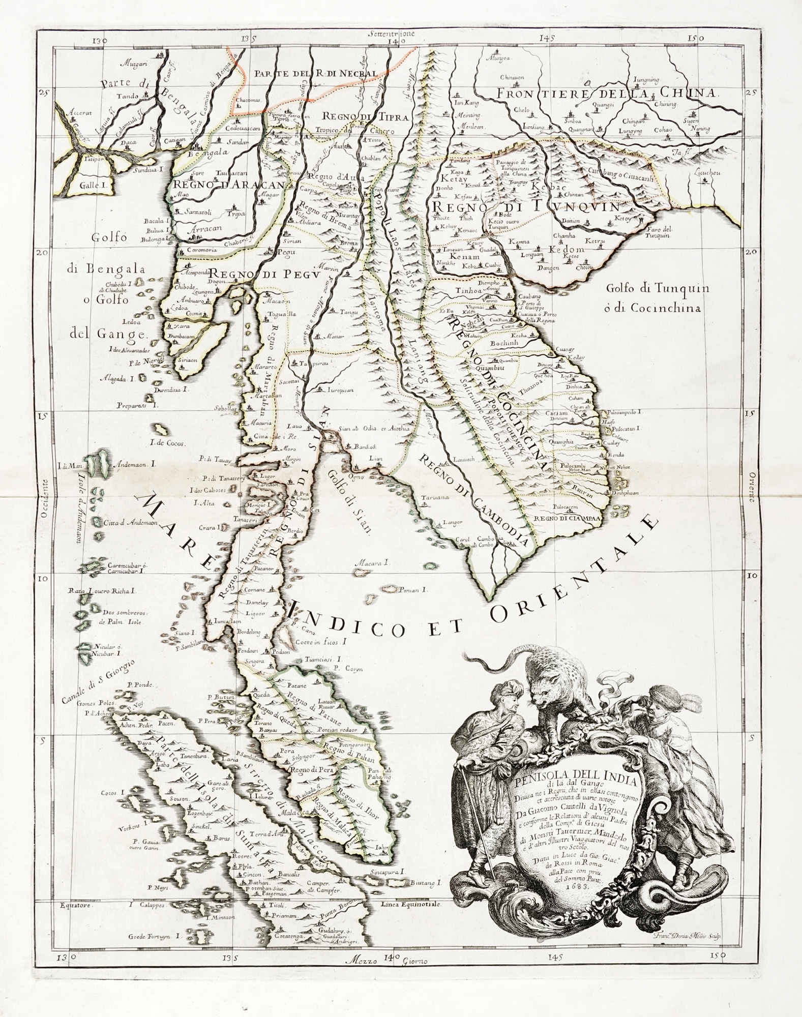 Incisione in rame con confini in coloritura. mm 535x410. Foglio: mm 612x478. Decorativa mappa di parte del Sud-Est asiatico, che si estende da Singapore e lo Stretto di Malacca a sud, fino alla foce del Gange e alla Cina sudorientale a nord. Carta tratta dal Mercurio geografico overo Guida geografica in tutte le parti del Mondo... raccolta di carte edita a Roma da de Rossi tra il 1660 e il 1730. (1) Foglio integro con margini come in origine. Piega di legatura in orizzontale al centro con brachetta di legatura al verso.