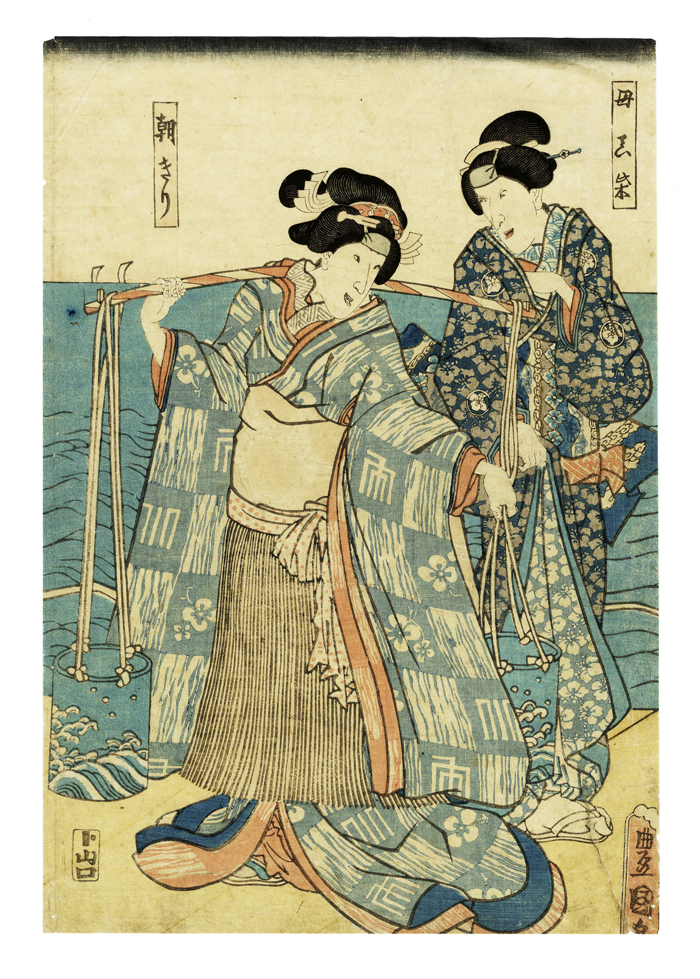 Utagawa Kunisada I (Toyokuni III), Arashi Koroku V nel ruolo della Madre (Haha) Shiba, e Bandô Shůka I nelruolo di Asagiri. 1851 (Kaei 4).