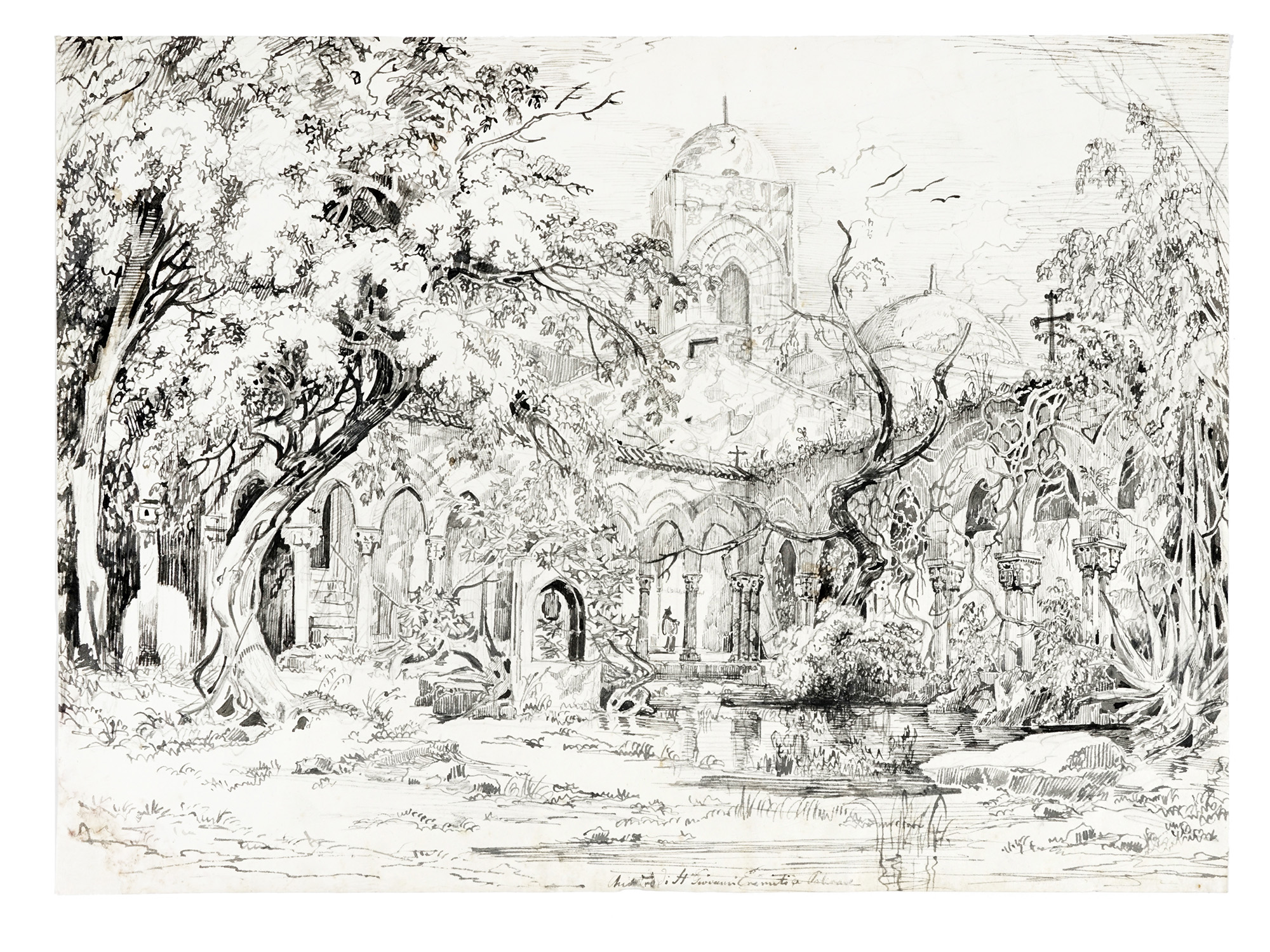 Coppia di matite, penne e inchiostro di china e acquerello su carta. mm 340/345x470/475. Uno firmato in basso a destra, l'altro titolato al margine inferiore. Opere realizzate durante il viaggio dell'artista in Sicilia. Dettagliatissimi scorci con eleganti chiaro-scuri. (2) Spellature leggere ad alcuni angoli. Tracce d'uso diffuse, nel complesso buono stato conservativo.