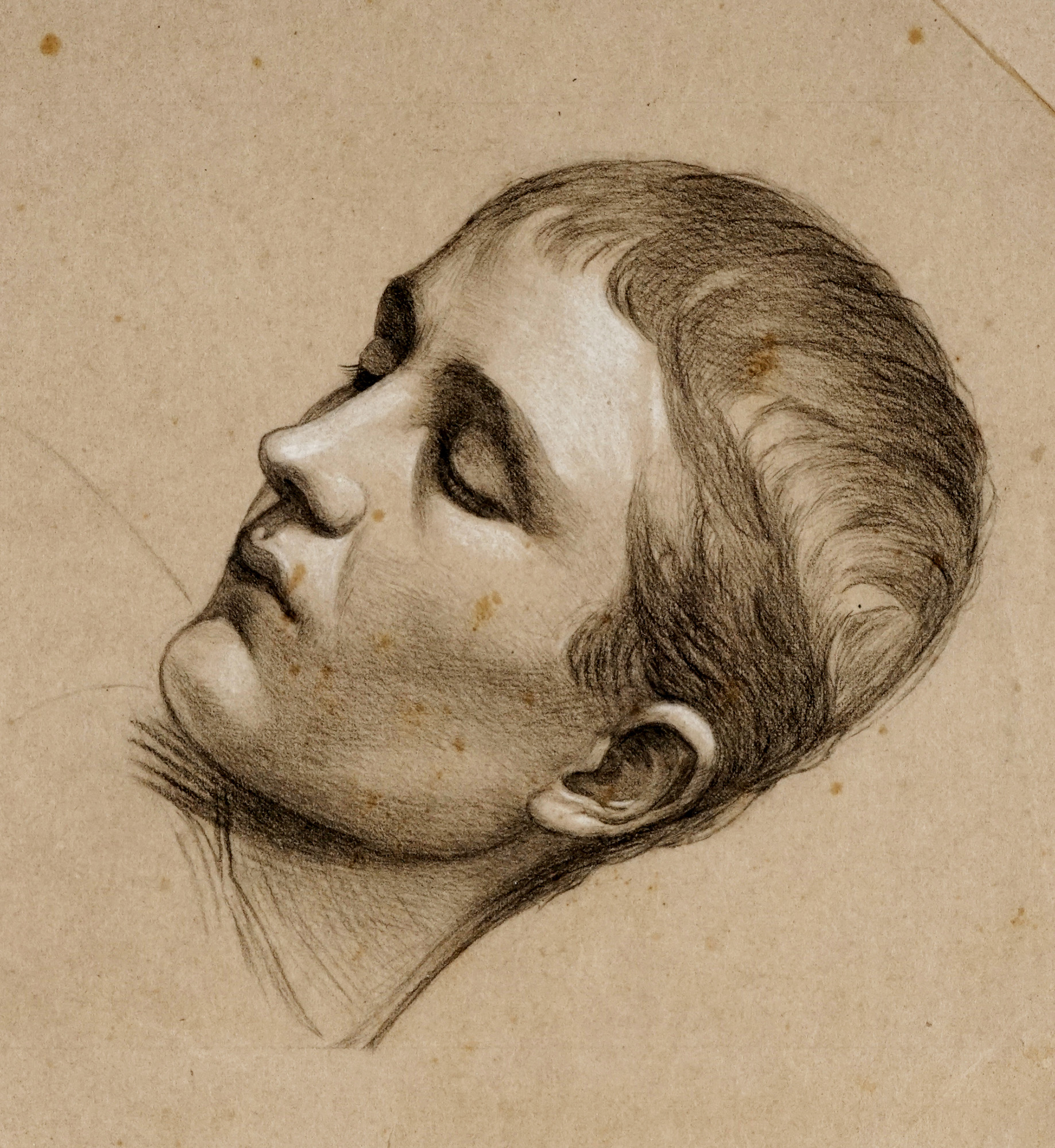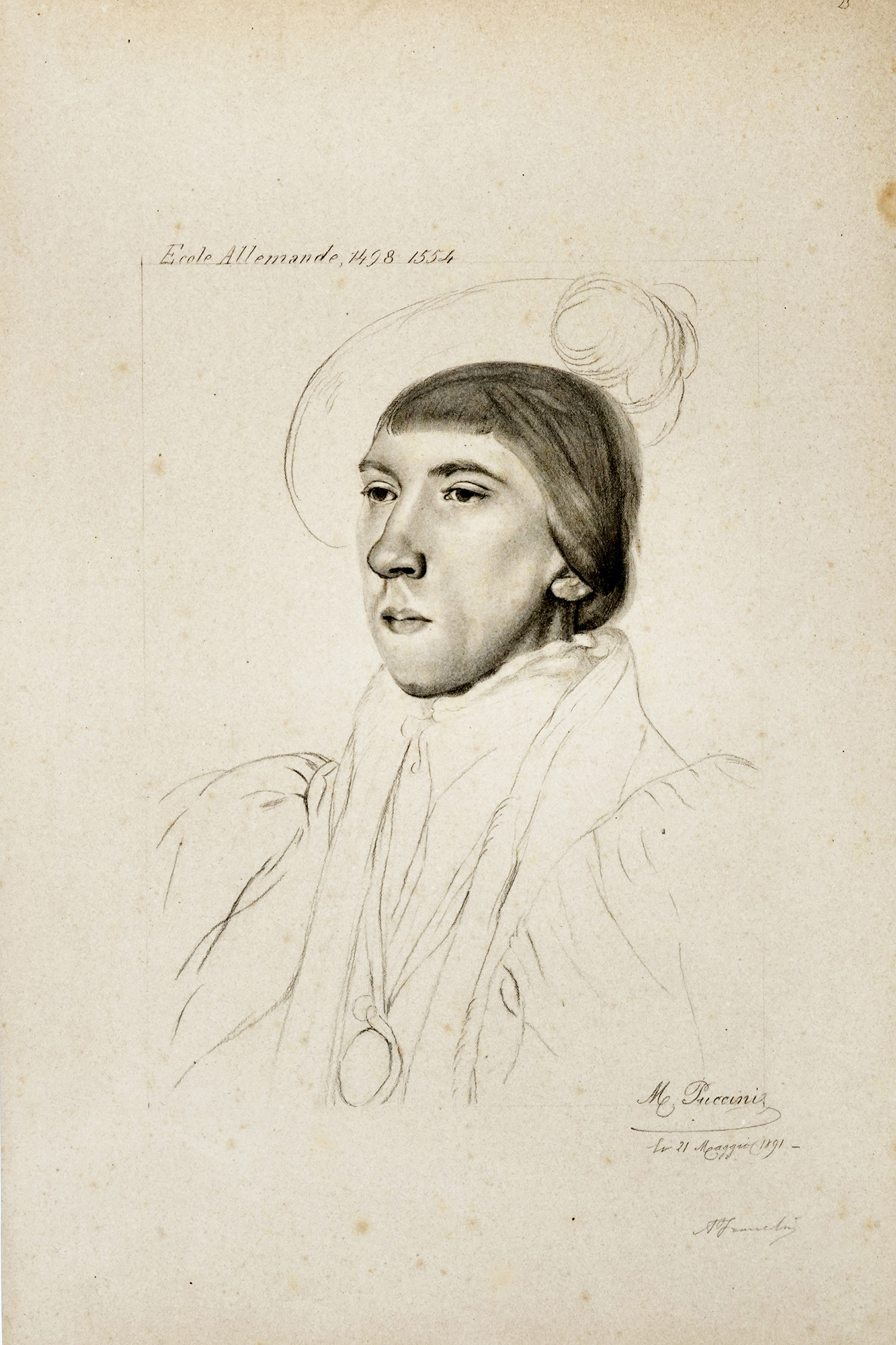 1) Ritratto di nobile. 1891. Matita su carta. mm 500x320. Firmata due volte e datata in basso a destra. "Ecole Allemande, 1498 - 1554" a matita in alto a sinistra. Disegno preparatorio per un probabile quadro mai realizzato. 2) Volto di ragazzo. Matita e pastello bianco su carta tabacco. mm 195x205. Iscritto: "Studio di M. Puccini" a matita sul verso. (2) OPERA 1: Foglio brunito con fioriture sparse. OPERA 2: Sporadiche fioriture con una piega angolare in alto a sinistra.