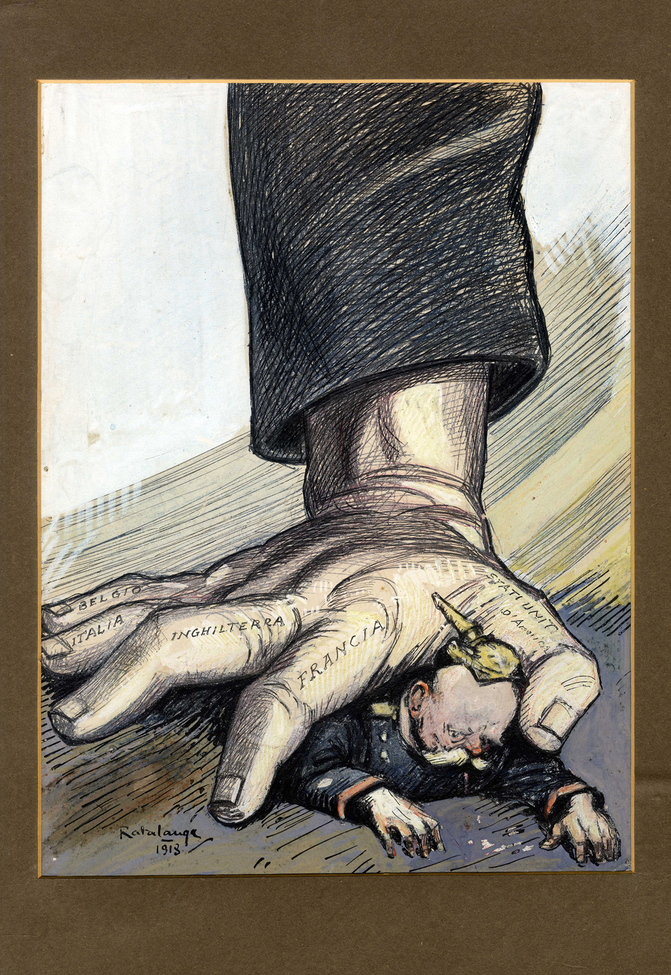 Rata-Langa [pseud. di Gabriele Galantara], Francesco Giuseppe d'Austria schiacciato dall'Alleanza. 1918.
