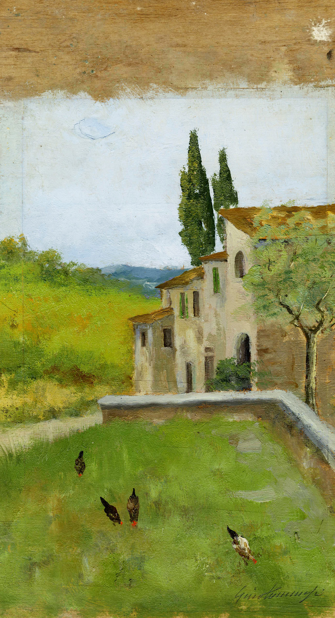 Gino Tommasi, Cortile. Olio su tavoletta. cm 31,5x18. Firmato a matita in...