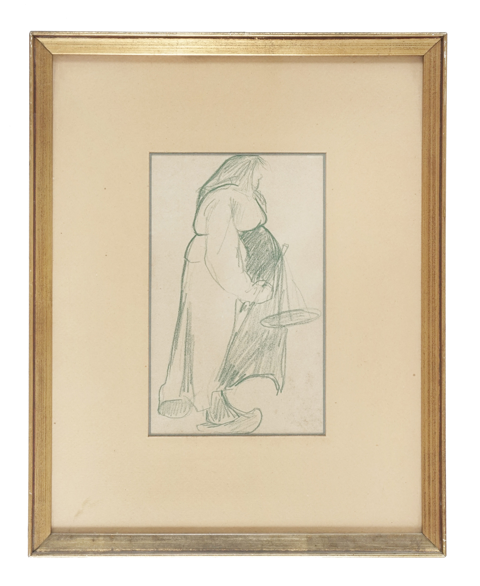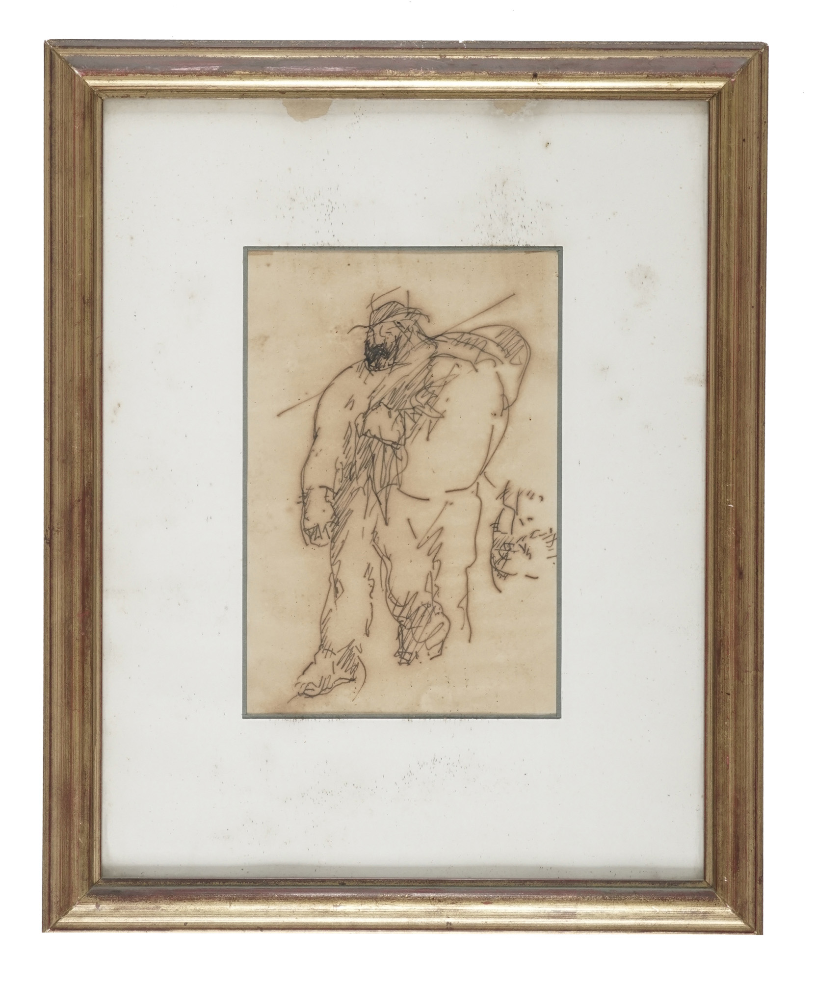 Coppia di disegni, uno a penna e inchiostro di china bruno, l'altro a pastello celeste. mm 180/190x115/120. Entrambi recanti etichetta di Galleria D'Arte La Navicella di Viareggio con doppi timbri della stessa, ciascuna applicata al verso della cornice. Titolo iscritto a penna al verso. Compongono il lotto Viandante e La pescivendola. (2) Entrambi in cronice con vetro: cm 35x27,5 cad. Viandante presenta alcune tracce d'uso sparse, nel complesso buona conservazione generale.
