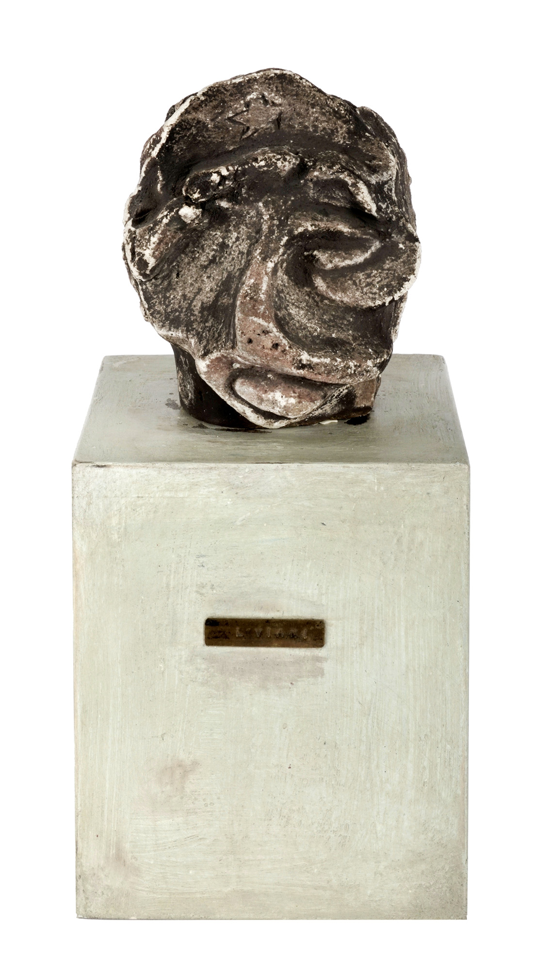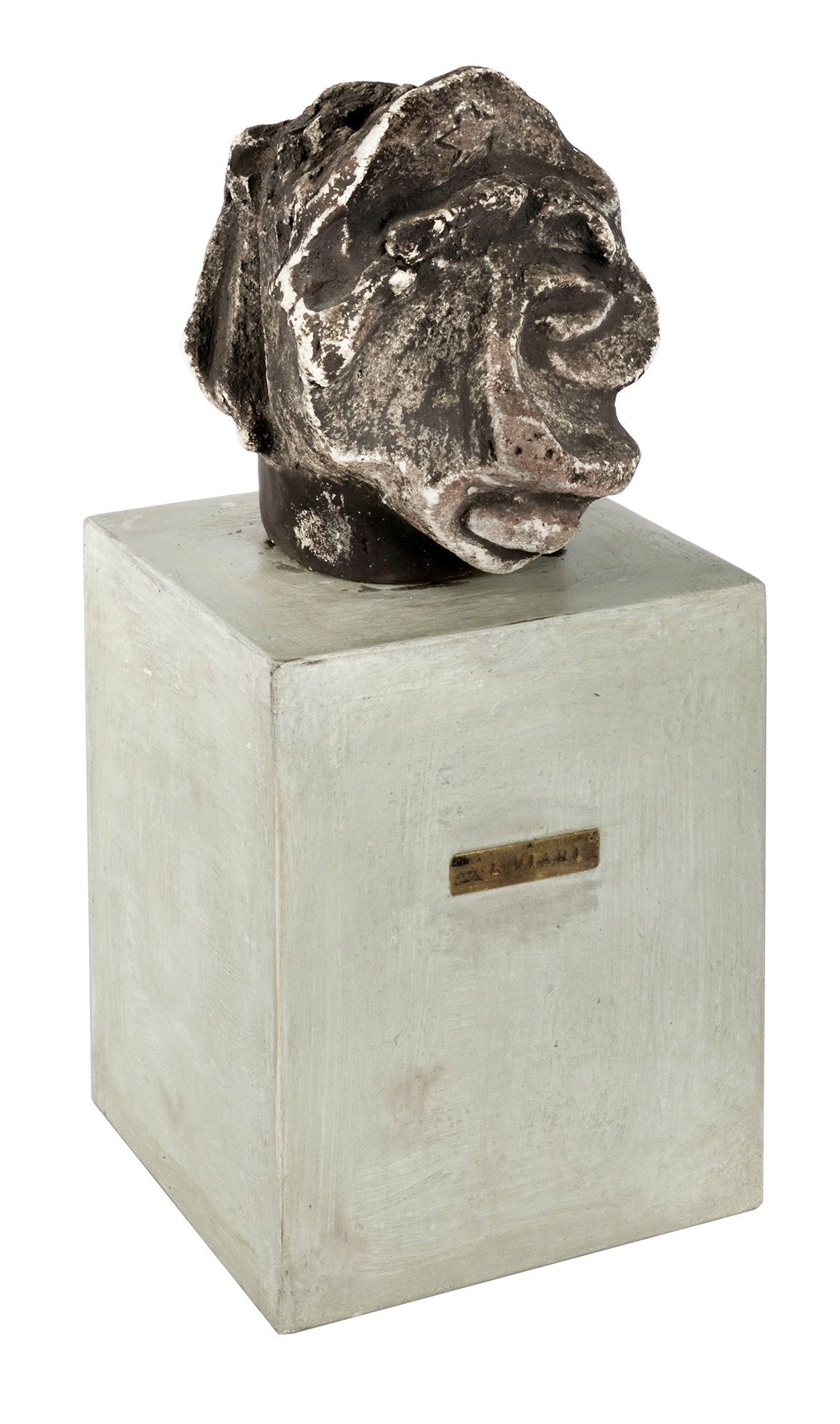 Scultura in gesso con basamento in legno smaltato bianco. cm scultura 20x15. cm basamento 25x20. Sigla scavata nel gesso nella parte destra del copricapo. Una stella incisa sul fronte del volto. Targhetta in ottone recante il nome d'artista applicata al basamento. Opera accompagnata da autentica su fotografia di Enrico Dei di Viareggio con sua firma a penna. (2) Testa con irregolarità dovute alla superficie porosa del materiale ma in ottimo stato conservativo. Basamento distaccato dalla scultura.