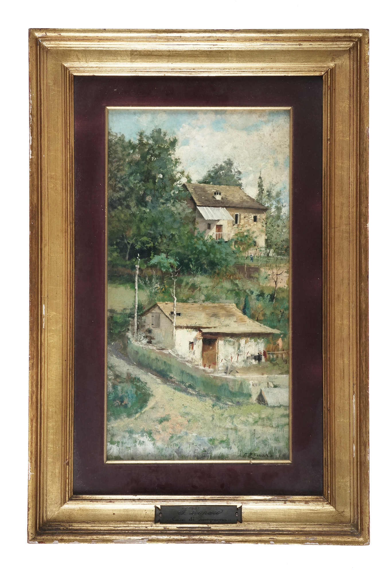 Fausto Zonaro, Case di campagna. Olio su tavola. cm 40x20. Firmato in basso a...