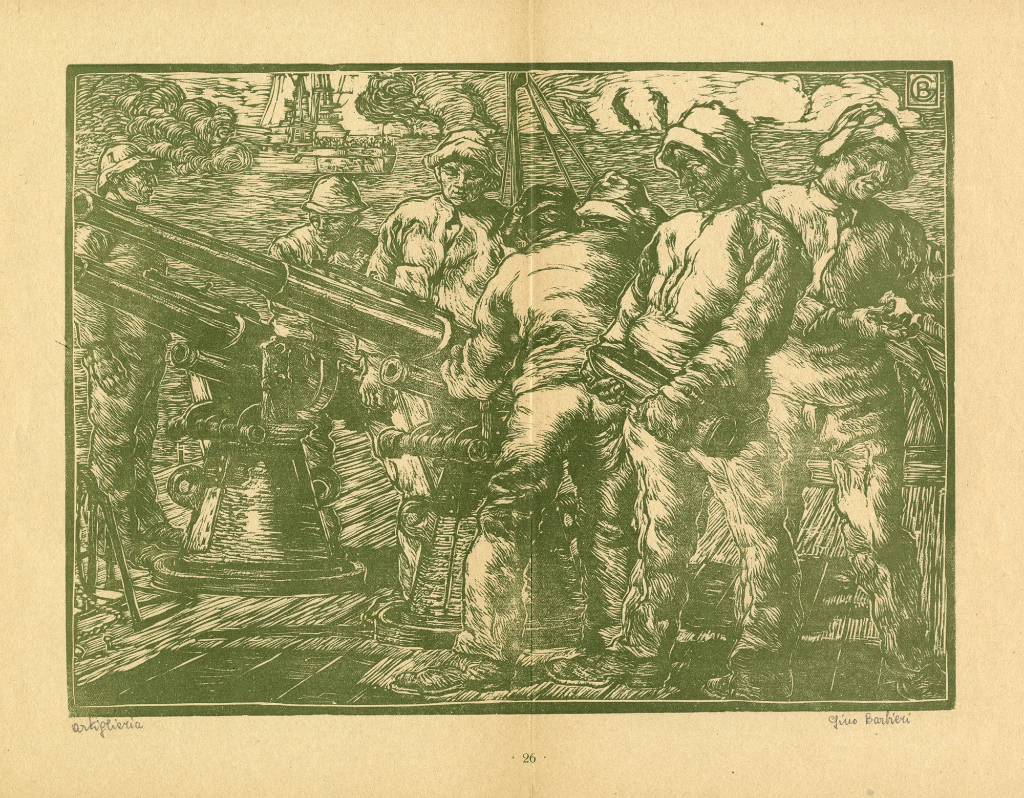Gino Barbieri, Lotto composto di 4 incisioni a tema militare. Xilografie. mm...