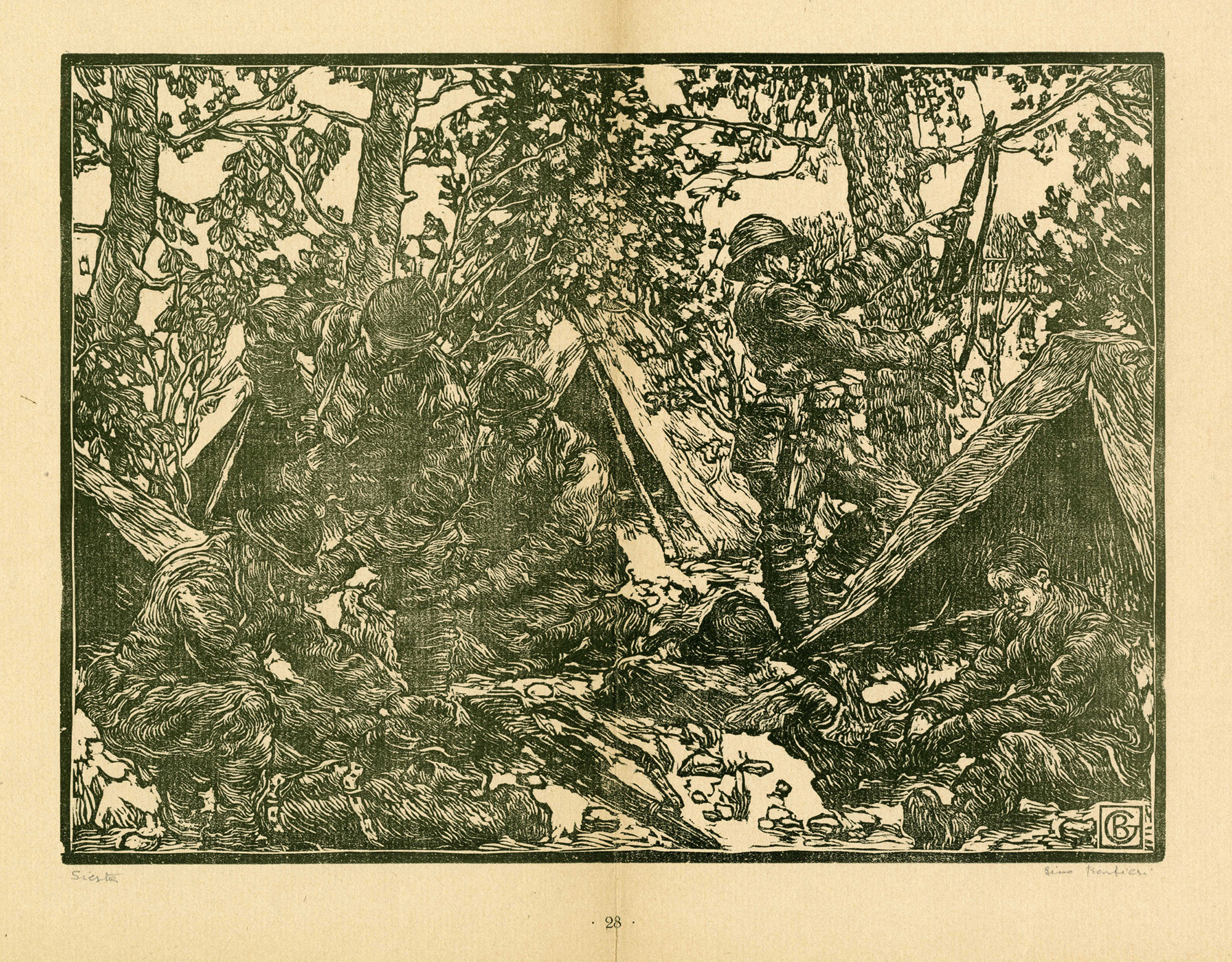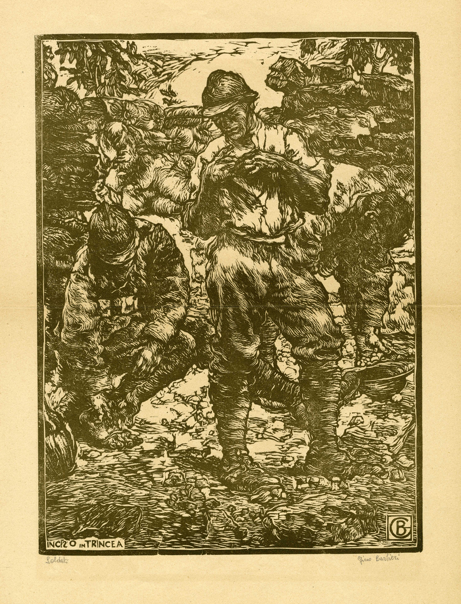 Xilografie. mm 230/315x230/320. Foglio: mm 445x305 (aperto) cad. Tutte monogrammate in lastra agli angoli. Una con iscrizione in lastra "Inciso in trincea". Ogni opera presenta il titolo a matita fuori lastra. Compongono il lotto le opere: Fanti, Artiglieria, Siesta e Soldati, ognuna estratta dalla rivista Xilografia. (4) Fogli con traccia do piega centrale. Piccole mancanze di supporto su alcuni lungo i margini. Incisi in ottimo stato conservativo.