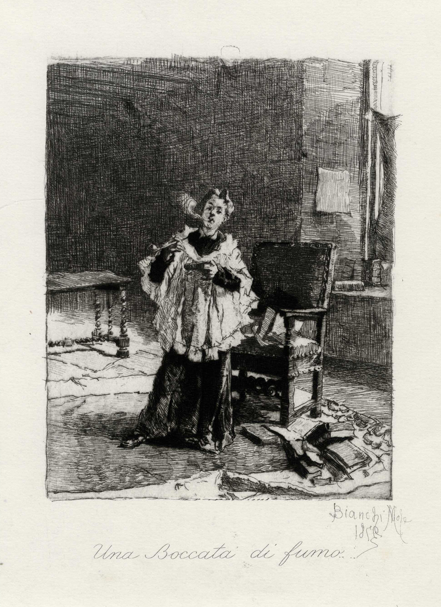Mosè Bianchi, Lotto composto di 3 incisioni. 1873. 1) Una boccata di fumo....