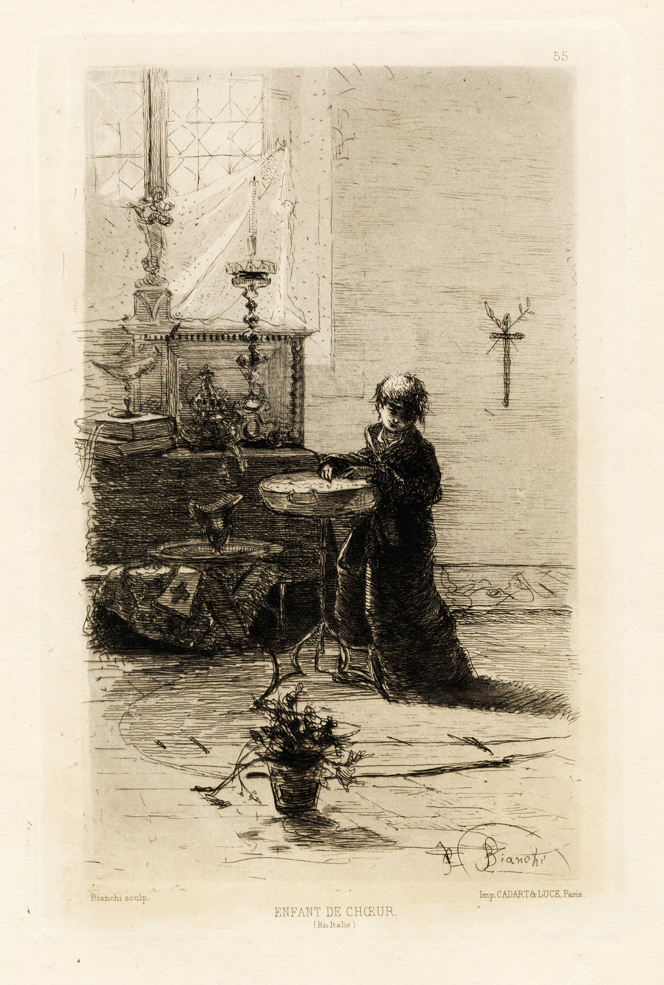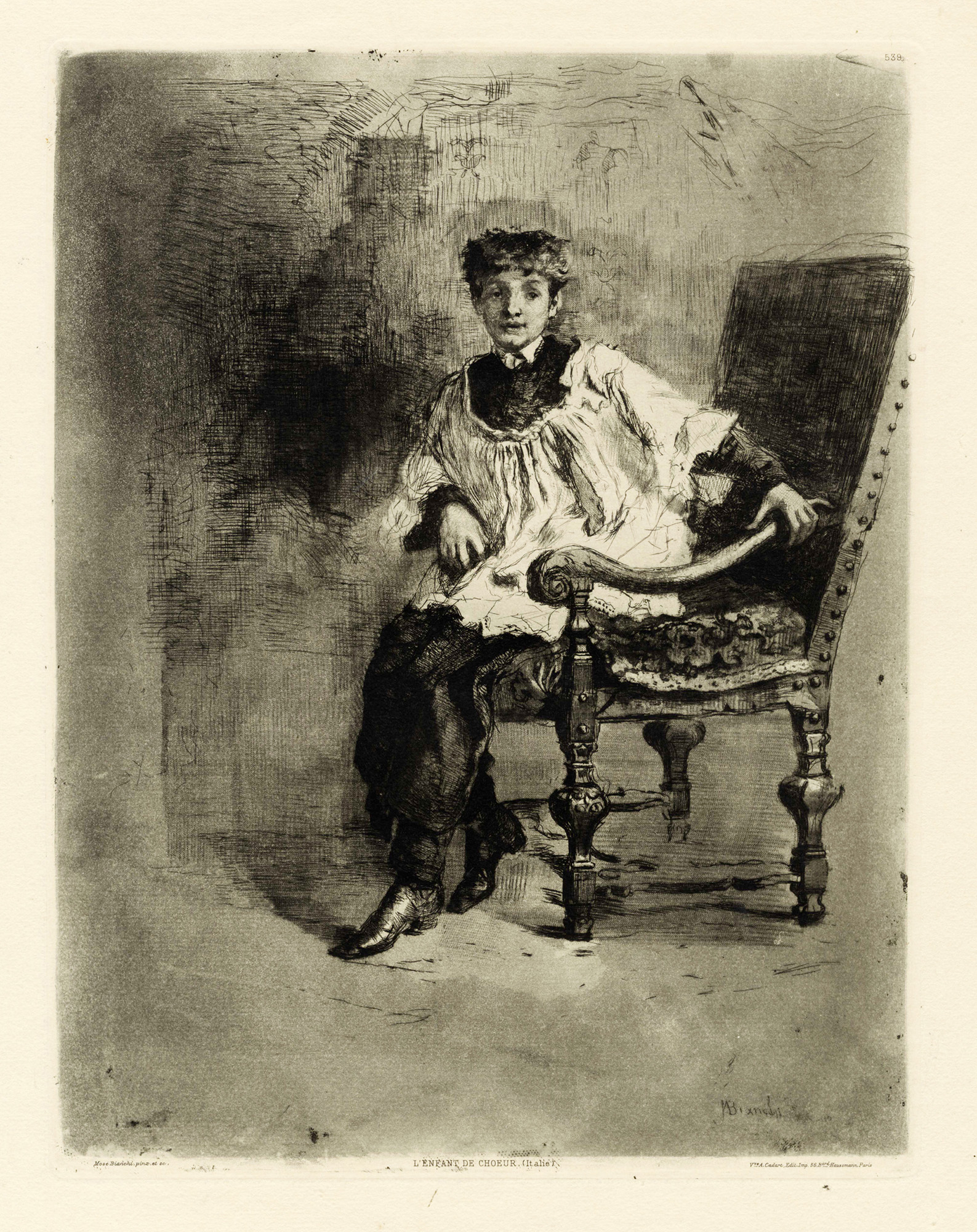 1) Una boccata di fumo. 1873. Acquaforte su velina applicata. mm 120x95. Foglio: mm 485x330. Firmata, datata e titolata in lastra al margine inferiore. Appunti di collezione a matita in basso a destra. 2) Enfant de chœur (En Italie). Acquaforte su carta vergellata. mm 205x125. Foglio: mm 490x345. Firmata in lastra in basso a destra. Dati editoriali a stampa lungo i margini. 3) L'enfant de choeur (Italie). Acquaforte. mm 290x220. Foglio: 490x345. Firmata in lastra in basso a destra. Dati editoriali a stampa lungo i margini. (3) Tracce d'uso con leggere bruniture su tutti i fogli. Ottima conservazione degli incisi.