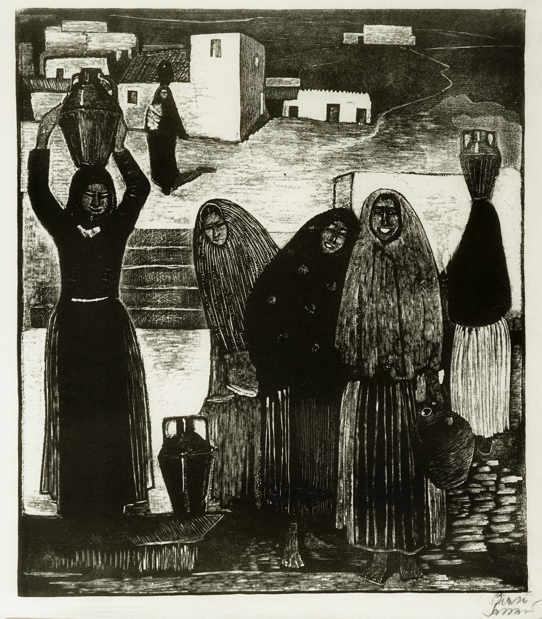 Giuseppe Biasi, Donne presso la fonte. 1934. Linoleografia su carta velina....