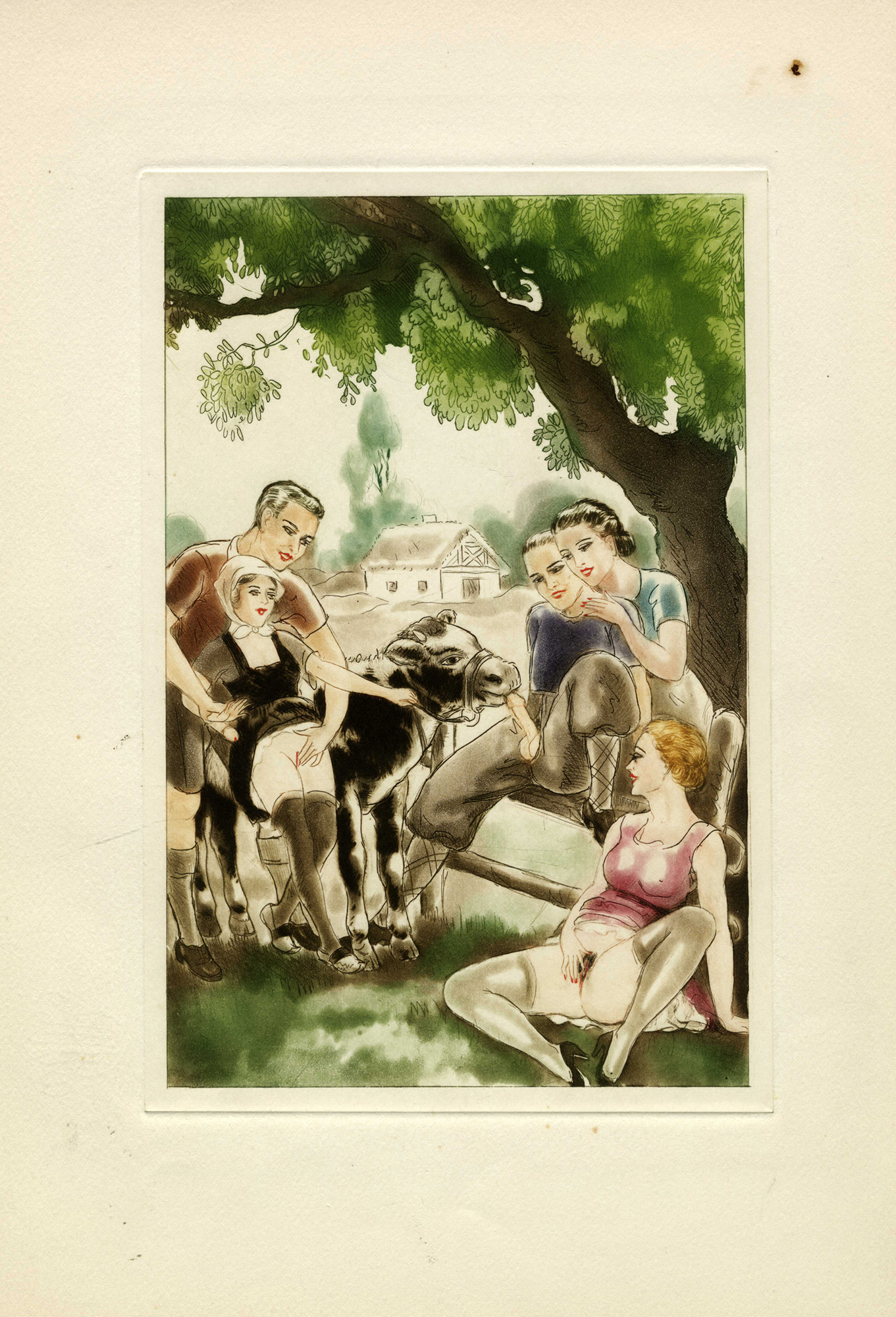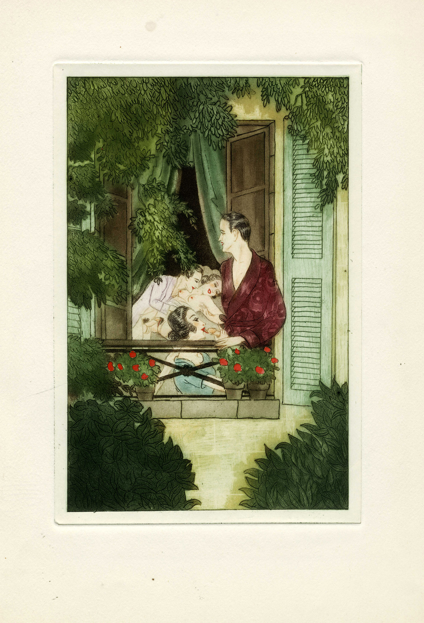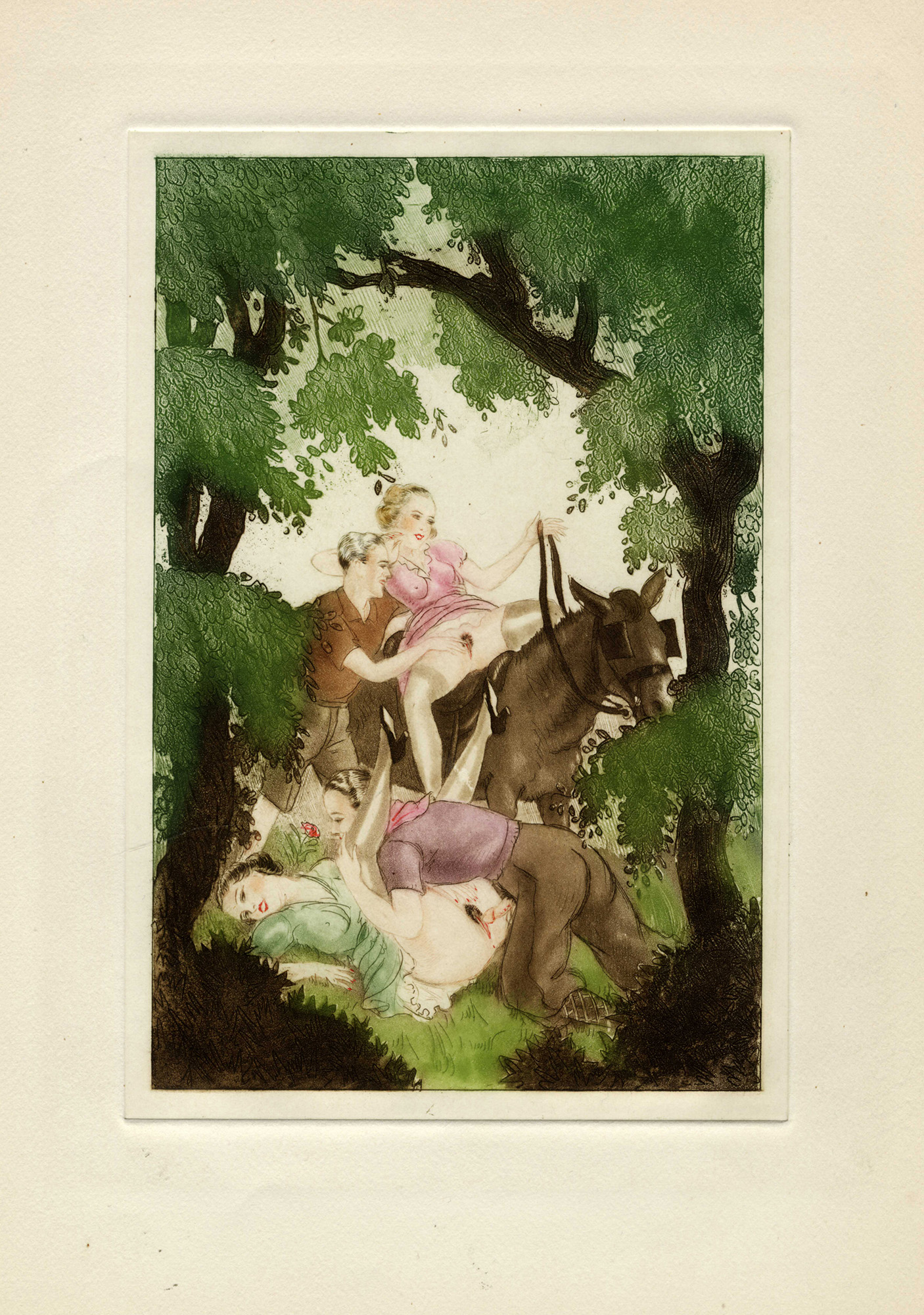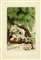 Raccolta di 9 acqueforti in coloritura ed un frontespizio conservate entro cartella contenitiva in cartone e tela. mm 220x145 ca. cad. Fogli: mm 327x240 cad. Titolata sia sul frontespizio inciso che sull'etichetta in carta applicata al piatto anteriore. Esemplare mancante di 3 incisioni. Realizzata in 150 esemplari, questa cartella non riporta il numero di tiratura. (1) Contenitore con difetti lungo i margini e aletta inferiore strappata. Qualche fioritura sparsa con una brunitura sul frontespizio. Tavole in ottimo stato conservativo.