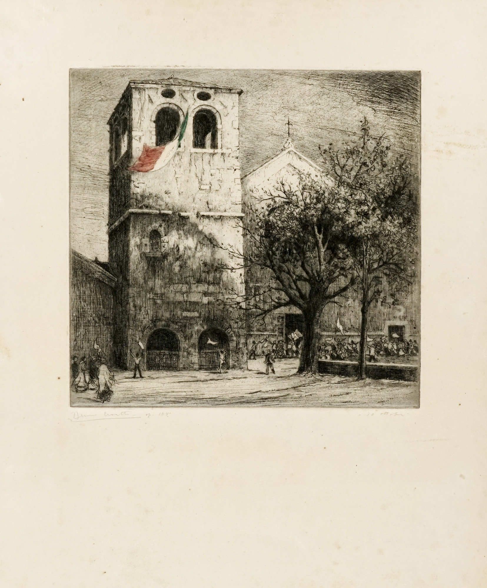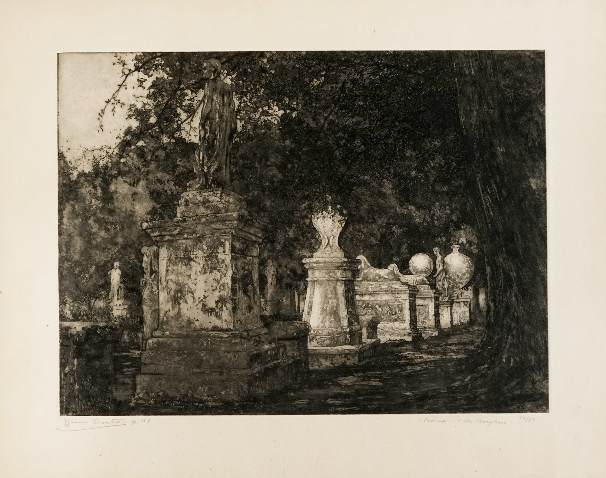 1) 30 Ottobre. Acquaforte con ritocco di colore manuale. mm 245x255. Foglio: mm 445x370. Firmata a matita in basso a sinistra, titolata a matita in basso a destra. 2) Roma, Villa Borghese. Acquatinta. mm 315x420. Foglio: mm 455x555. Firmata a matita in basso a sinistra, titolata e numerata a matita in basso a destra. Es. 33/80. (2) Fogli leggermente bruniti, altrimenti ottima conservazione degli incisi.