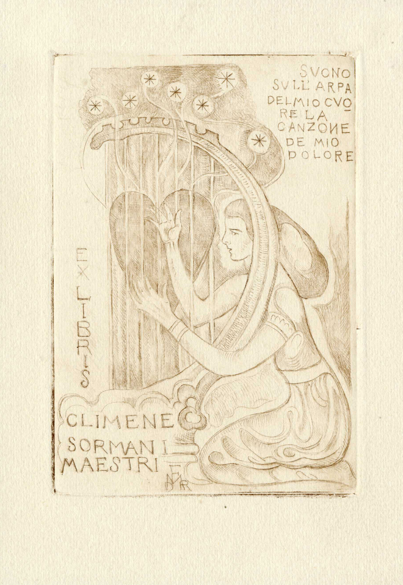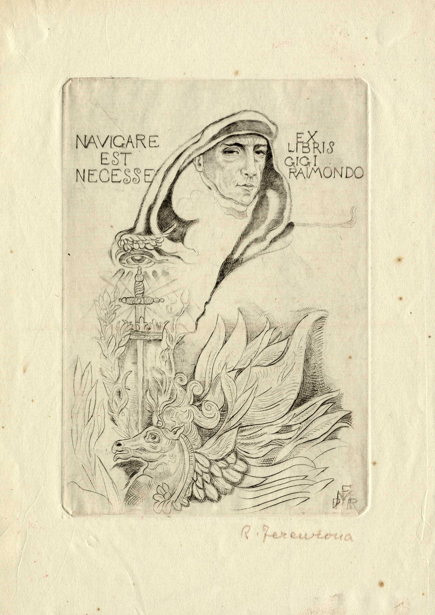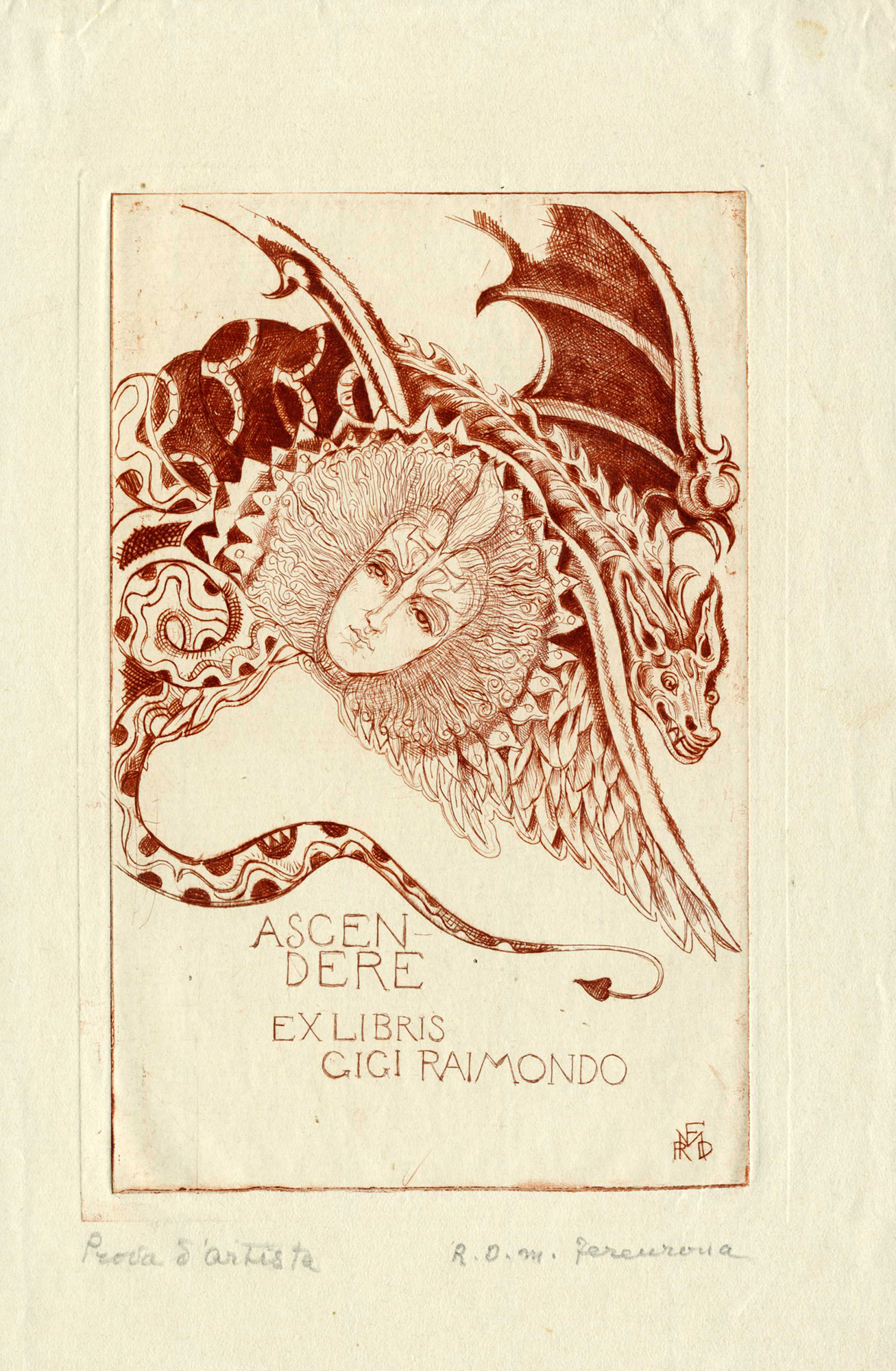 Raccolta di 3 incisioni tra puntesecche e fotoincisioni. mm 127/168x85/115. Foglio: mm 170/237x120/175. Due incisi su carta vergellata e firmati a mano in basso a destra. Compongono il lotto le incisioni: Ex libris Gigi Raimondo - Navigare est necesse, Ex libris Gigi Raimondo - Ascendere e Ex libris Climene Sormani Maestri - Suono sull'arpa del mio cvore la canzone del mio dolore. (3) Fogli parzialmente applicati al margine superiore su cartoncino di supporto. Minimi difetti lungo i margini, altrimenti ottima conservazione generale.