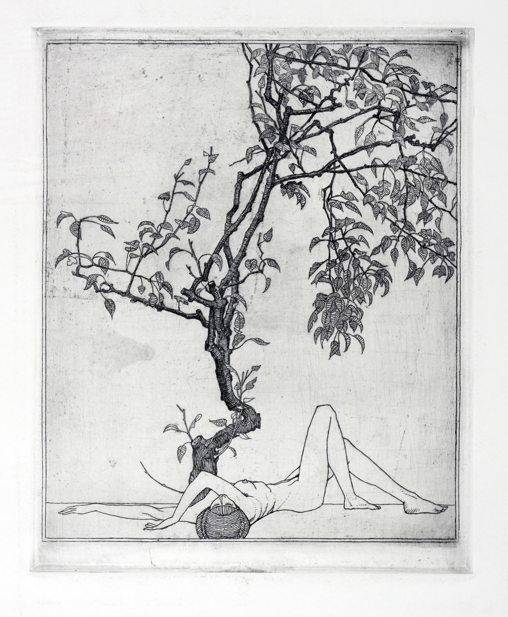 Acquaforte sabbia. Inciso: mm 273x222. Lastra: mm 298x235. Foglio: mm 690x495. BELLINI-ALBERTI, 63. Alberti data con riserva l'incisione al 1948 sulla base della testimonianza della moglie dell'artista, nonostante lo stile riconducibile al Liberty. Propendiamo tuttavia per la data 1913 riportata dal più recente Benvenuto Disertori. Un segno Liberty, catalogo della mostra a cura di Alessandra Tiddia, Mart, Trento, 2012. (1) Un leggero alone rosato al margine sinistro che si espande per parte della lastra, altrimenti inciso in ottimo stato conservativo