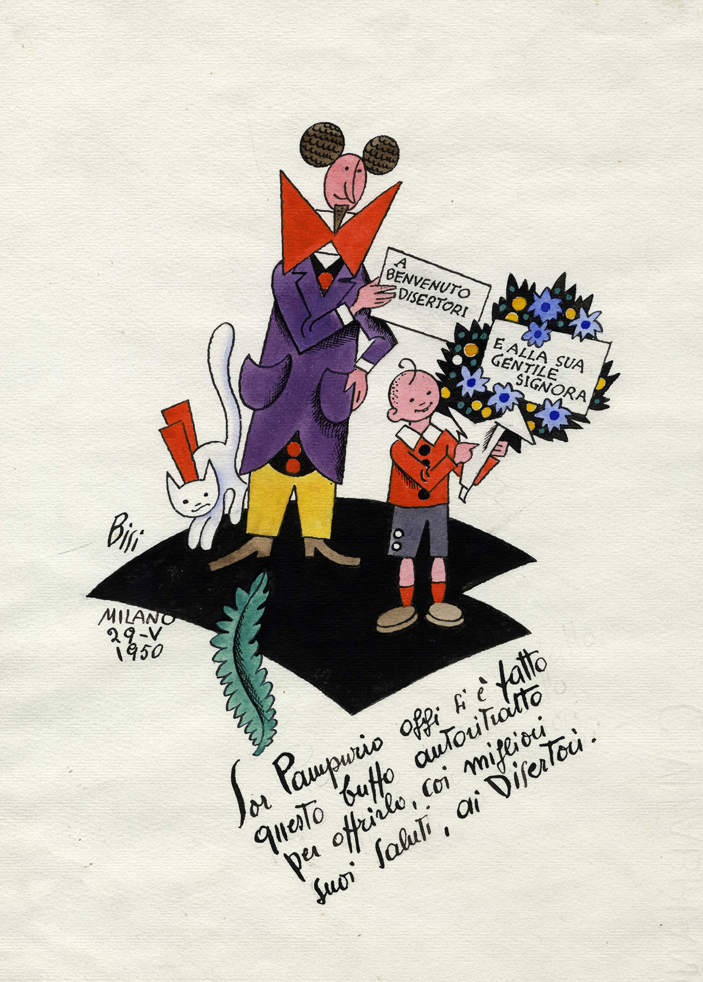 Acquaforte e bulino su carta vergellata. Inciso: mm 234x209. Lastra: mm 306x236. Foglio: mm 487x340. BELLINI-ALBERTI, 48. Siglata in lastra in basso a destra, firma a timbro in basso a destra. Il vaso visibile in basso a sinistra è un elemento che compare accanto alle Tre Grazie anche in alcune tra le più antiche rappresentazioni, ma risulta arricchito di una nuova valenza: se si osserva si scopre che esso è rotto e attraverso la fenditura fuoriesce un trapano, evidente riferimento di natura sessuale. SI AGGIUNGE: Bisi C., Vignetta con dedica. 1950. Penna e inchiostro di china e acquerello su carta. mm 315x230. Firmata e datata in basso a sinistra. "Sor Pampirio oggi si è fatto questo buffo autoritratto per offrirlo, coi migliori suoi saluti, ai Disertori." iscritto al margine inferiore. Provenienza: Eredi Disertori. (2) OPERA 1: Piccole pieghe ai margini con brunitura uniforme. Inchiostrazione ottima in buono stato conservativo. OPERA 2: Foglio applicato agli angoli a carta di supporto. Ottima conservazione.