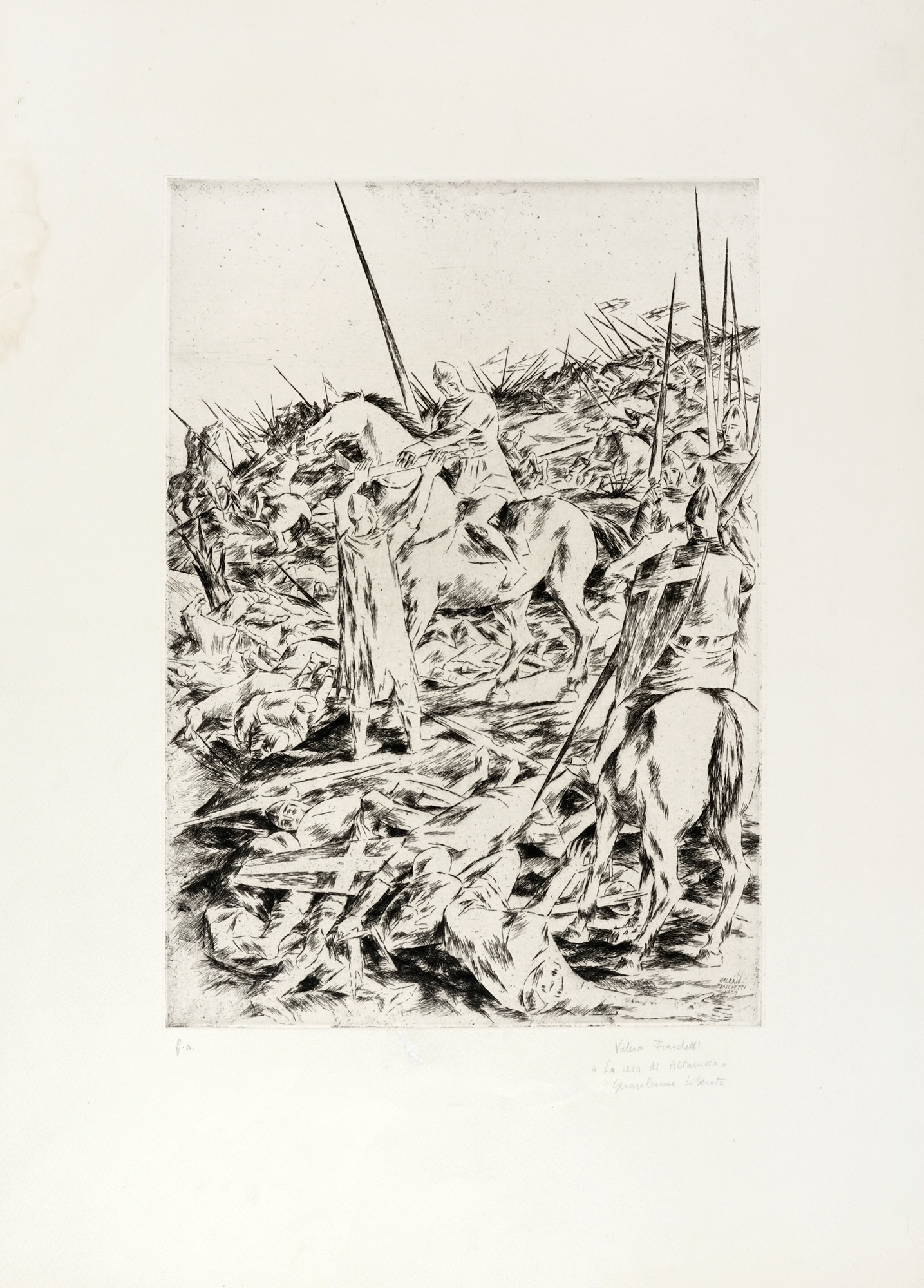 Acquaforte. mm 470x330. Foglio: mm 780x565. Firmata e datata in lastra in basso a destra. Controfirmata e titolata a matita in basso a destra. "P. a." a matita in basso a sinistra. (1) Una gora d'acqua all'angolo superiore sinistro. Difetti al margine inferiore. Ampi margini con inciso in ottimo stato conservativo.