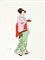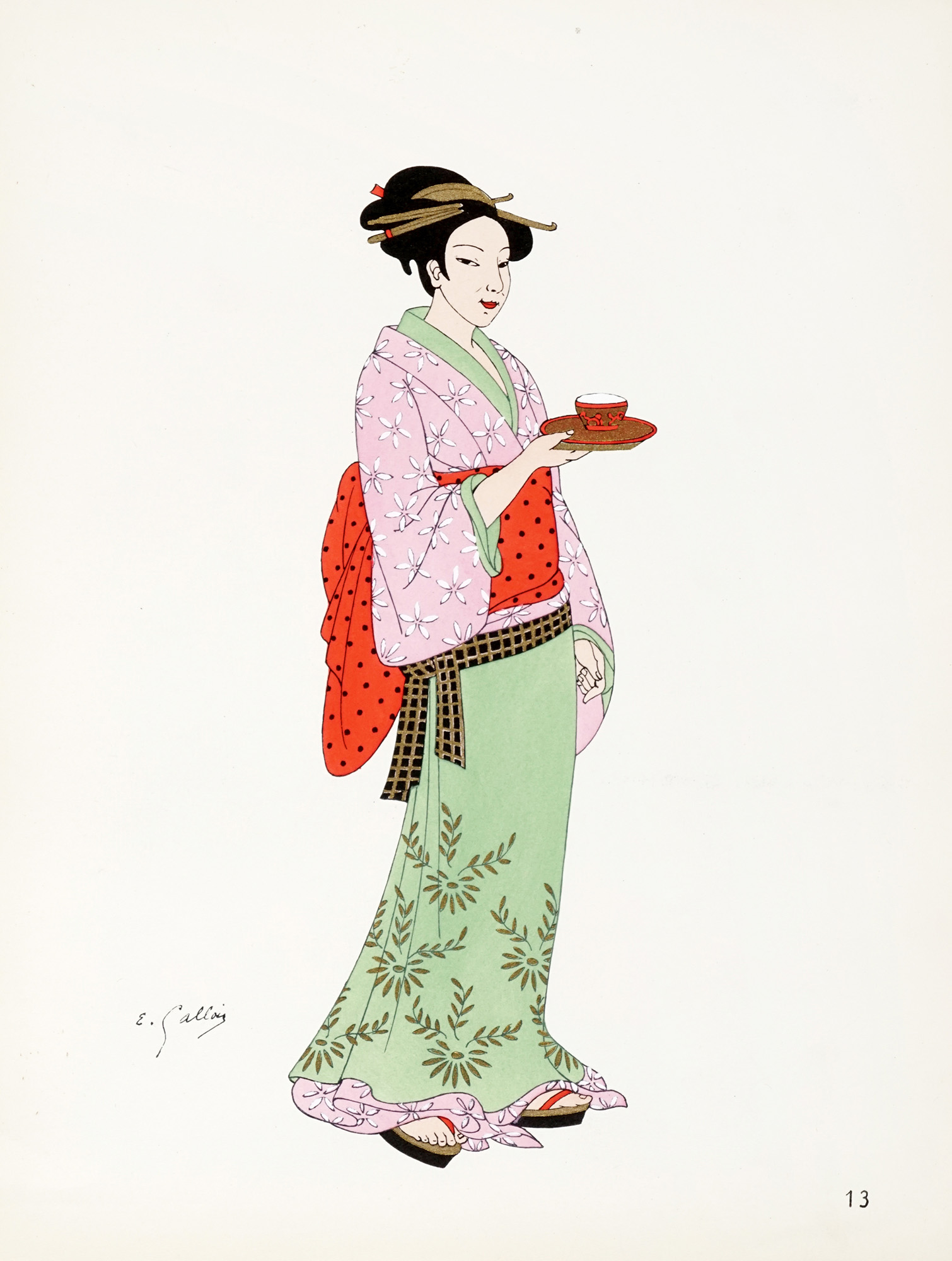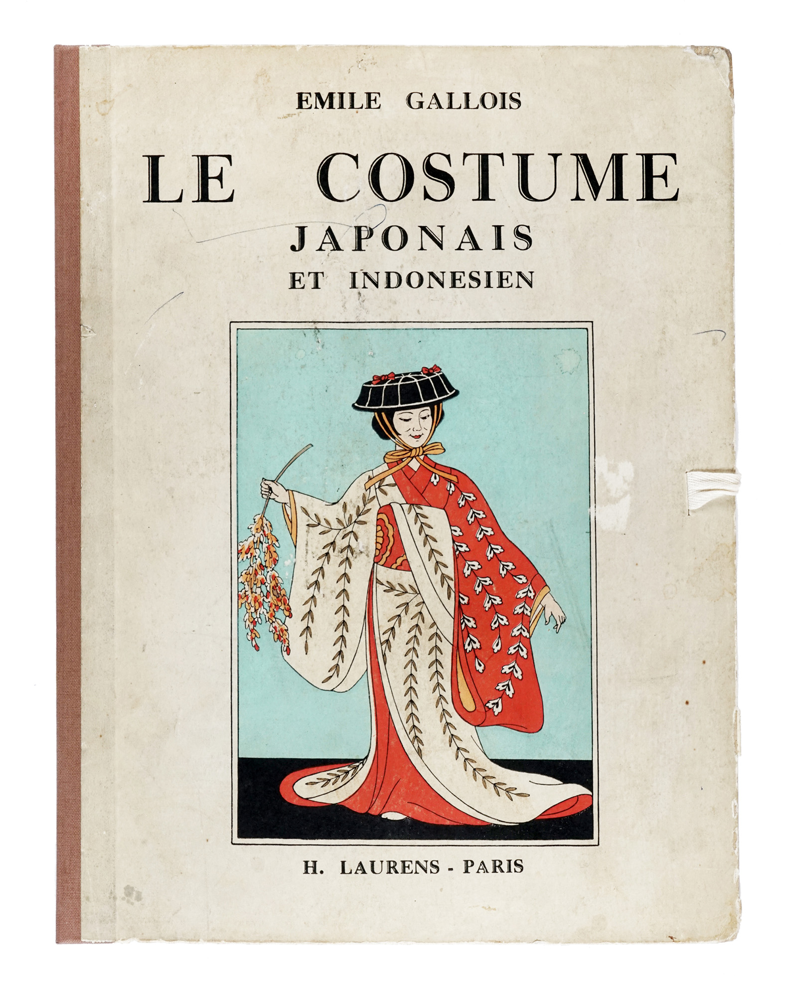 Raccolta completa di 48 tavole in litografia e pochoir con nobilitazioni in oro e argento contenute entro cartella in cartone e laccio in stoffa. mm 260x180 ca. cad. Fogli: mm 320x250 cad. Ognuna firmata e numerata progressivamente in lastra lungo il margine inferiore. Titolo, dati editoriali, prefazione ed indice delle plance a stampa su piccolo pamphlet rilegato. Bella raccolta di costumi che spaziano dall'abbigliamento comune a quello di corte, 38 di queste dedicate al Giappone, le restanti 10 illustrano invece l'estetica indonesiana. (1) Cartella contenitiva con un restauro alla costa. Tracce d'uso e difetti sparsi sui piatti. Tavole con minime bruniture e leggerissimi difetti agli angoli. In generale ottimo stato conservativo.