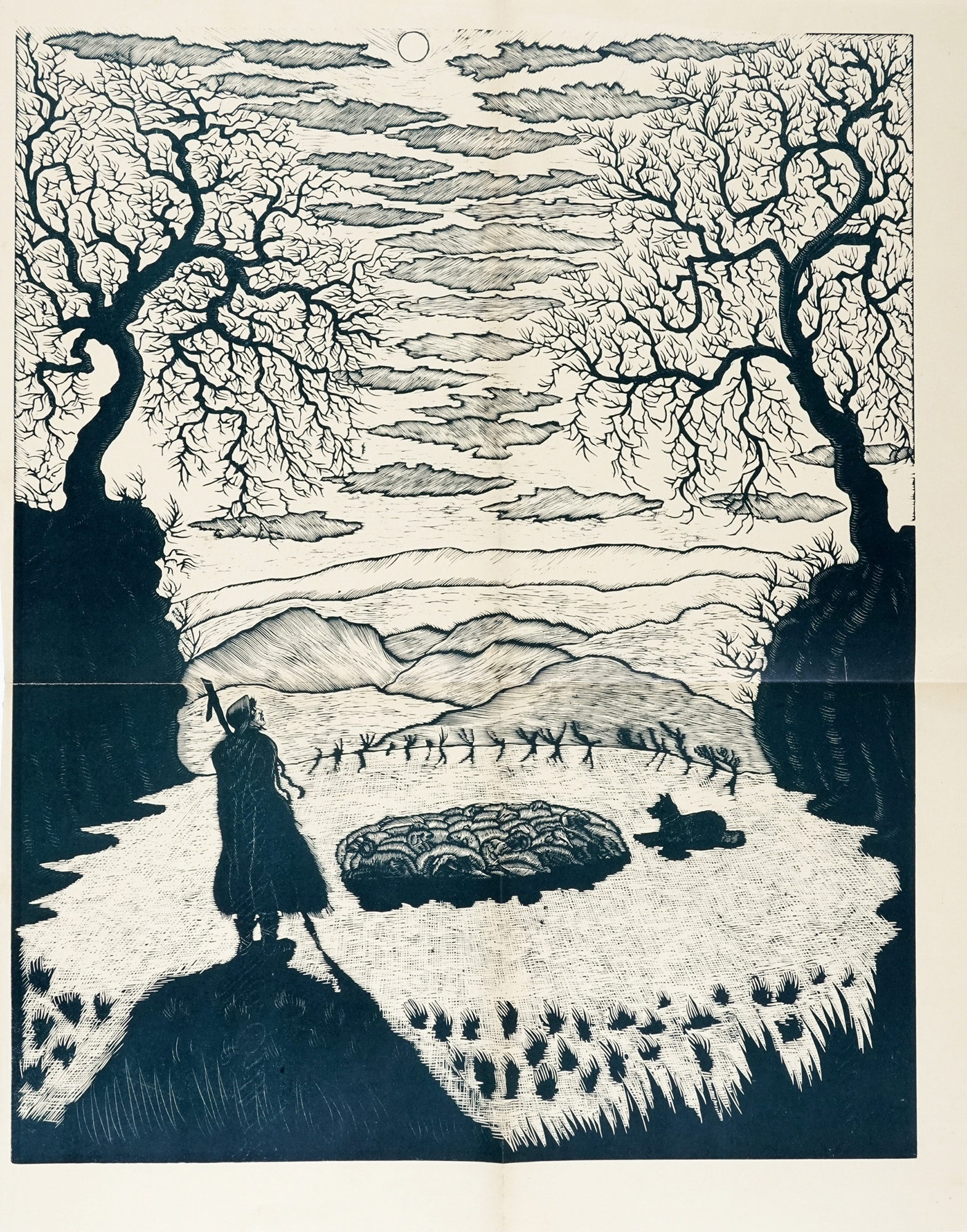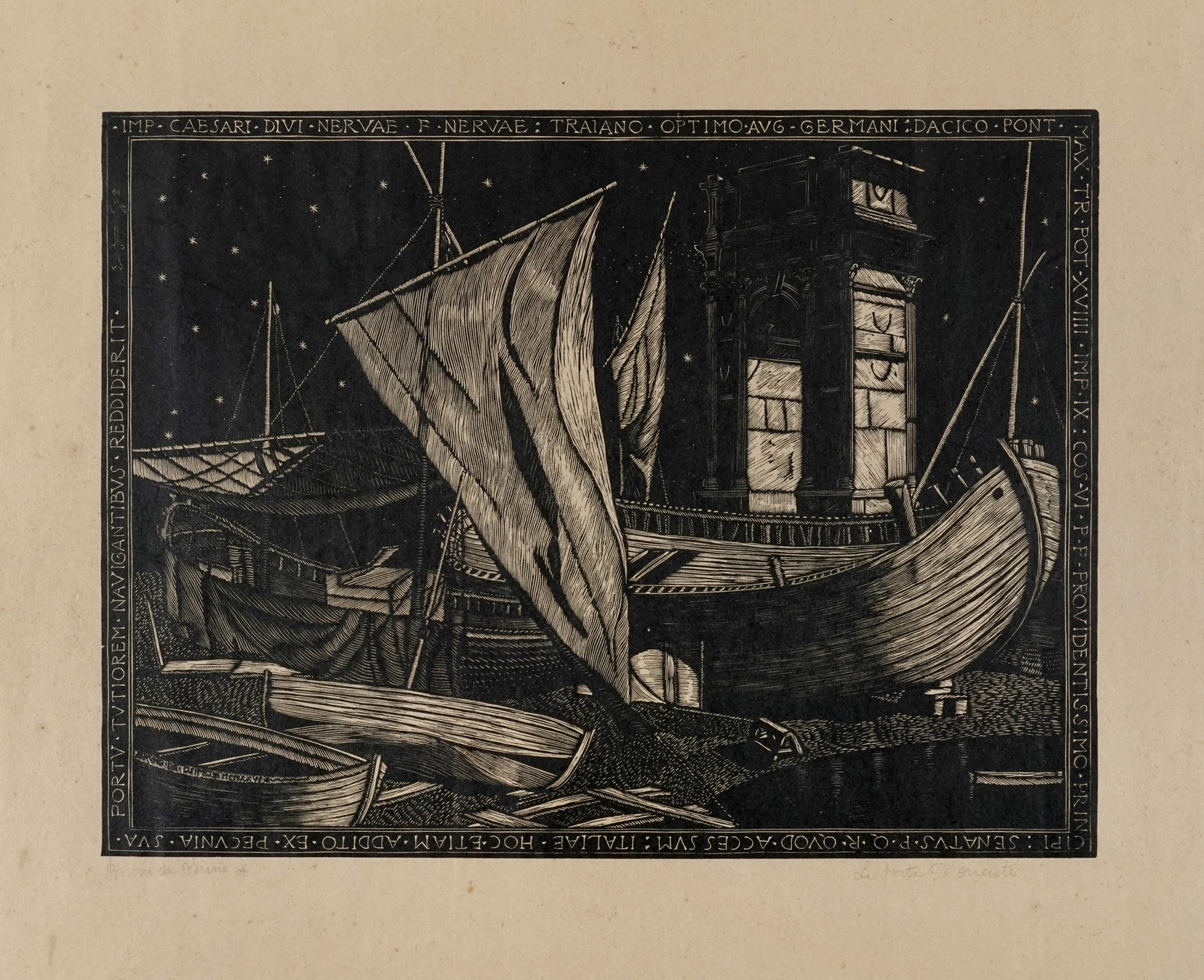 1) La porta d'oriente. 1926. Xilografia. mm 277x370. Foglio: mm 385x477. Firmata e datata in lastra in basso a sinistra. Controfirmata a matita in basso a sinistra, titolata a matita in basso a destra. 2) Canto notturno d'un pastore errante. Xilografia. mm 480x375. Foglio: mm 530x415 (aperto). Artista e titolo a stampa sul verso del foglio. (2) OPERA 1: Foglio parzialmente applicato a passe-partout. Brunitura di superficie, altrimenti ottima conservazione. OPERA 2: Tracce di piega verticale ed orizzontale con impercettibili strappetti marginali. Ottima conservazione generale.