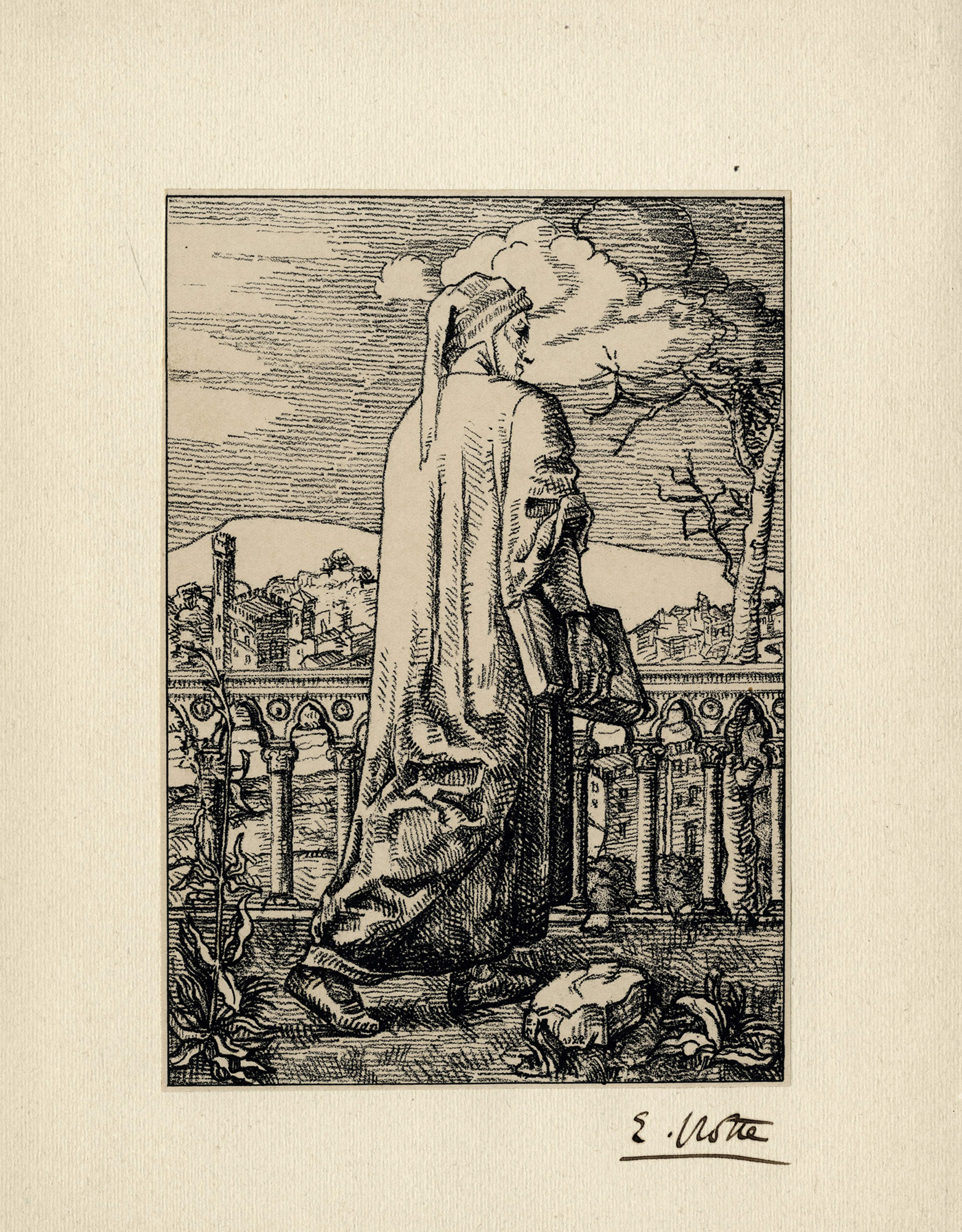 Gli indovini. (Inferno XX); Forese. (Purgatorio XXIV). Litografie. mm 200x150 cad. Fogli: mm 310x245. MELONI, 105-106. Le incisioni sono firmate a matita in basso a destra, una numerata in basso a sinistra. Controfirmate, datate e titolate in lastra. Un foglio timbrato a secco in basso a sinistra. Es. 88/100. Illustrazioni per: Alighieri D., La Divina Commedia novamente illustrata da artisti italiani. Firenze: Giorgio&Piero Alinari, 1922. SI AGGIUNGE: Notte E., Dante Alighieri. Litografia su velina applicata su cartoncino. mm 205x140. Foglio: mm 310x245. Firmata a penna e inchiostro di china bruno in basso a destra. Litografia destinata insieme alle due di Alberto Martini alla tiratura di testa di 100 esemplari della Divina Commedia a cura di V. Alinari (Firenze: Alinari, 1922). (3) Fogli totalmente applicati a cartoncino di supporto. Ottima conservazione generale.