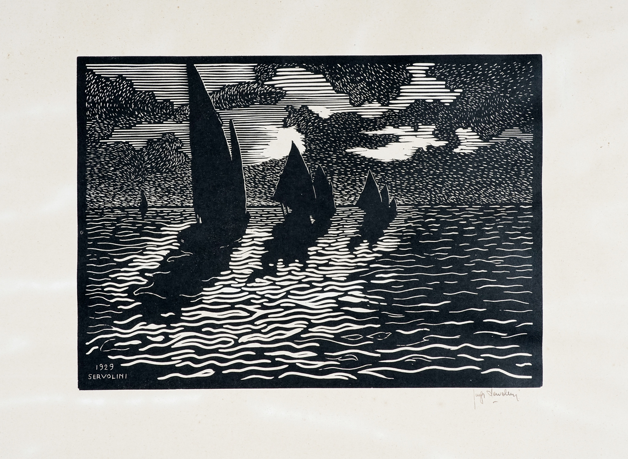 Xilografia a 10 legni. mm 290x345. Foglio: mm 360x425. CAGIANELLI, 207. Firmata nella matrice in basso a destra. Impressione perfetta con inchiostrazione brillante e materica. SI AGGIUNGE: Id., Barche. 1929. Xilografia. mm 250x350. Foglio: mm 450x550. Firmata e datata in lastra in basso a sinistra, controfirmata a penna e inchiostro di china bruno in basso a destra. Esemplare raro. (2) Foglio totalmente applicato a passe-partout di supporto. Ottima conservazione.