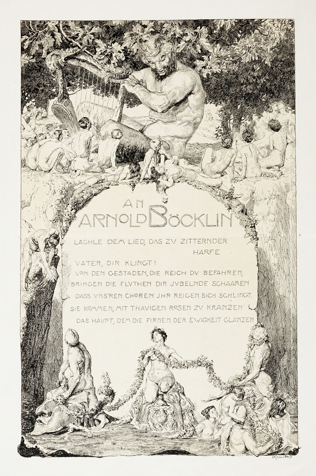 Litografia. mm 415x255. Foglio: mm 505x365. Titolato e datato in lastra al centro, firmato in lastra in basso a destra. Programma stampato in litografia al verso del foglio. SI AGGIUNGE: Id. An Arnold Böcklin. 1892. Litografia. mm 395x250. Foglio: mm 455x300. Firma e data in lastra in basso a destra. Testo a stampa al verso. (2) OPERA 1: Foglio con brunitura diffusa. Gore d'acqua al margine inferiore e difetti marginali. Buona conservazione. OPERA 2: Tracce di piega orizzontale con piccoli strappi ai margini. Buona conservazione.