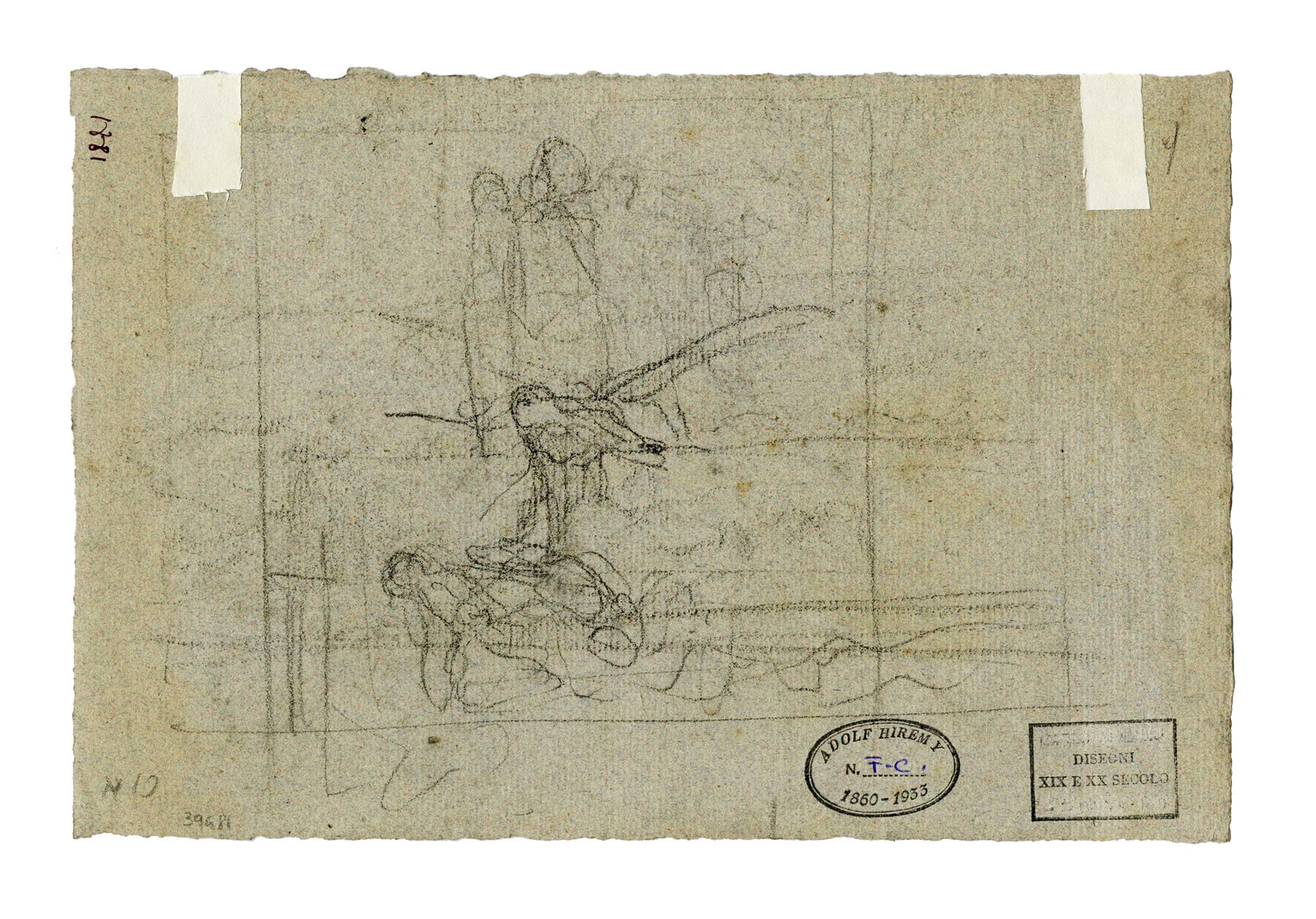 Carboncino nero e bianco su carta vergellata. mm 160x235. Al verso: ulteriore schizzo a matita con coppia di timbri ad inchiostro nero, uno recante "Adolf Hiremy 1860 - 1933" con codice "N. F.C." e l'altro con iscritto "Disegni XIX e XX Secolo". Datato a penna e inchiostro di china bruno all'angolo superiore sinistro. Il soggetto ritratto sembra riprendere le pose dei protagonisti dello studio ad olio su tela per il quadro Prometheus, realizzato successivamente nel 1892. (1) Coppia di punti adesivi a nastro al margine superiore del verso. Ottima conservazione generale.