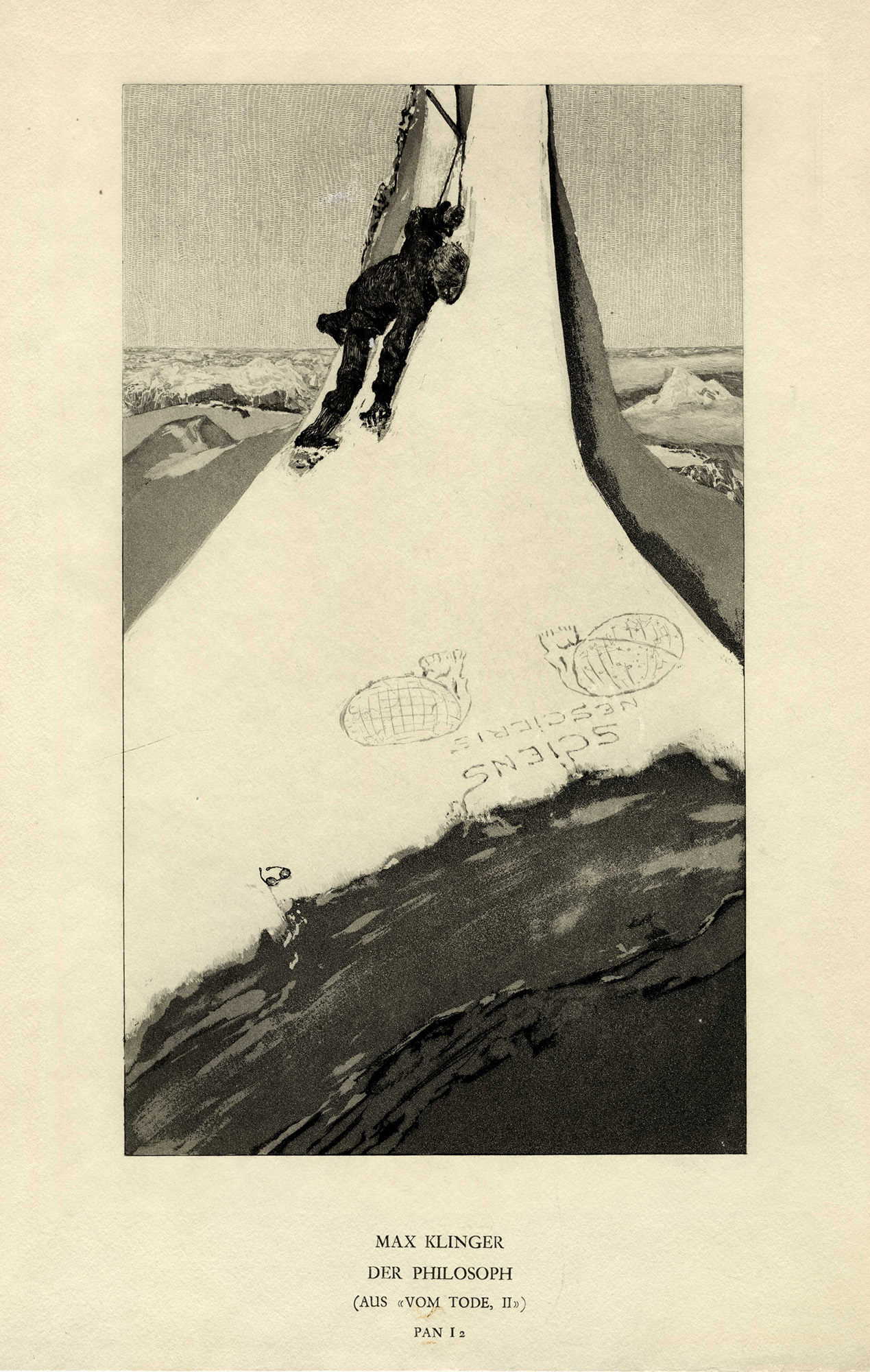Acquaforte e acquatinta. mm 297x199. Foglio: mm 355x260. SINGER, 244. Stampato nel margine inferiore, al centro: «Max Klinger / Der Philisoph / (Aus «Vom Tode, II») / Pan I 2». Incisione tratta dal periodico d'arte Pan, vol. I, n. 2 (Luglio-Agosto 1895). Editore: Genossenschaft Pan GmbH, Berlin. Stampatore: Otto Felsing, Berlin. Incisione nel III stato su 3. (1) Trascurabili difetti lungo il margine superiore ed inferiore. Inciso in ottimo stato conservativo.