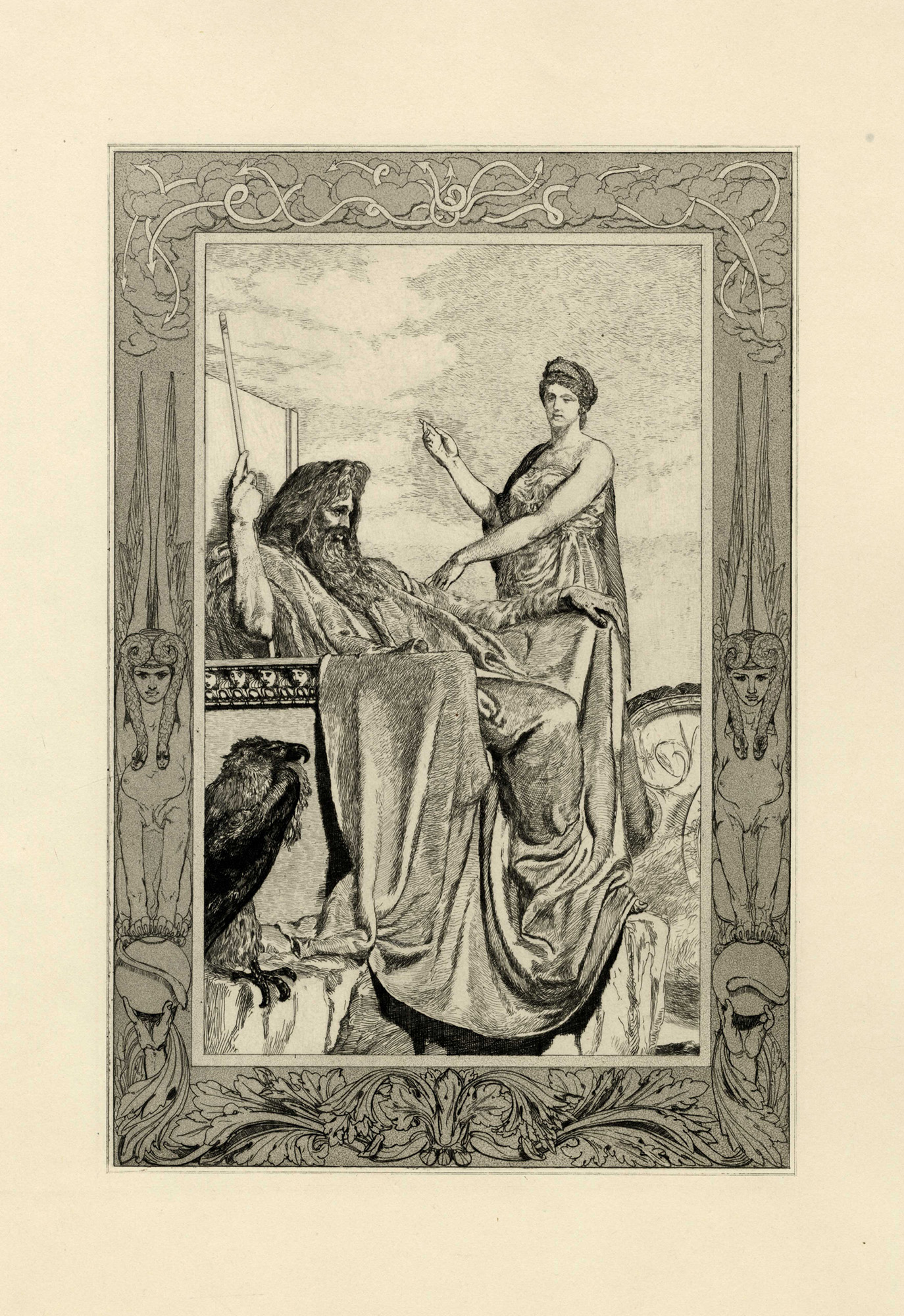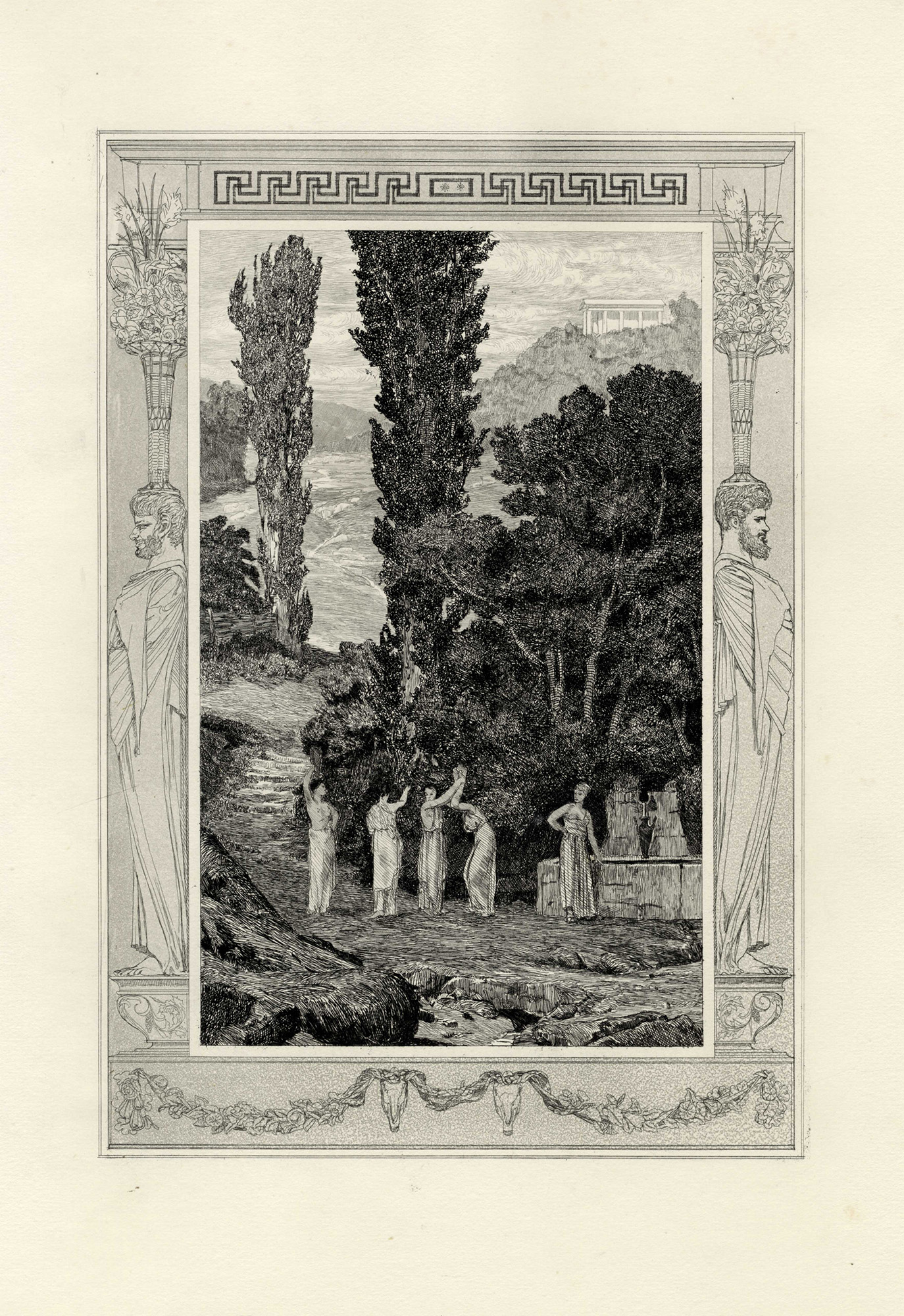 Raccolta di 4 acqueforti e acquetinte. mm 255x170 cad. Foglio: mm 340/353x240/254. Compongono il lotto le tavole: Giove e Venere, Psiche su una roccia, Psiche nel Tartaro e Venere e le sue sorelle. Bellissima serie dall'impressione ottima con bordature riccamente decorate. Incisioni tratte dalla cartella Amor und Psyche. Opus V, che comprende complessivamente 24 tavole numerate progressivamente, di cui 15 con un'incisione a piena pagina ciascuna e 9 con 32 vignette riunite per gruppi. La cartella non è menzionata da Singer (il quale, invece, scheda la stessa serie tratta dal libro pubblicato nel 1880 da Theo Stroefer) e probabilmente è databile successivamente al 1909. (4) Ottima conservazione.