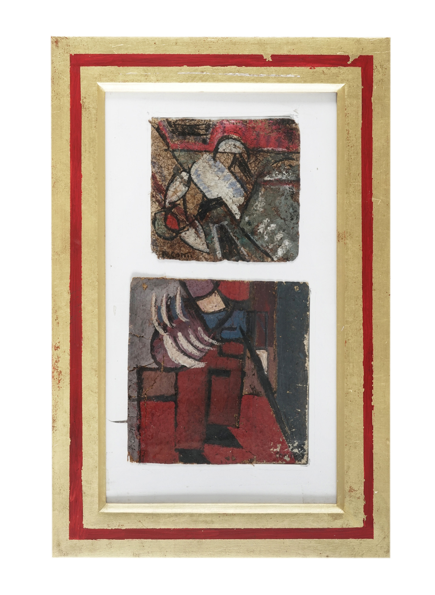 Oli su tela di iuta. Prima opera: cm 9x10. Seconda opera: cm 12x12. Entrambe firmate al margine inferiore. (1) In cornice con vetro: cm 34x22,5. Dipinti applicati su stesso cartone di supporto. Le opere presentano una crettatura diffusa concentrata principalmente sulla prima opera. Buona conservazione.