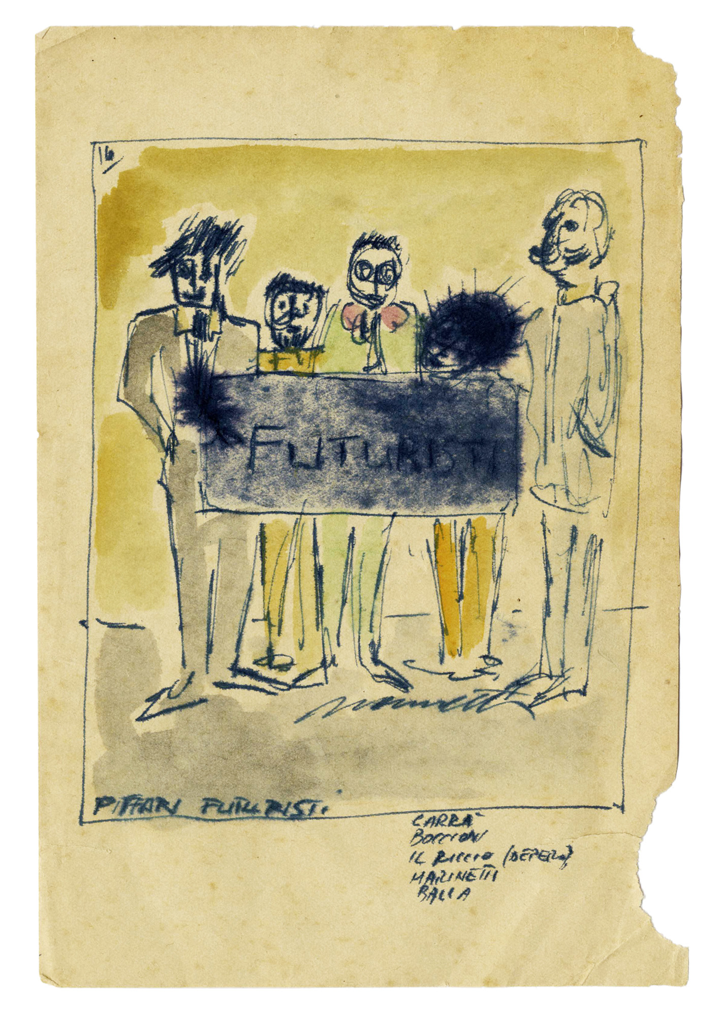 Acquerello, penna e inchiostro di china su carta. mm 200x133. Firma in basso a destra, titolo in basso a sinistra e, a fianco, sono riportati i nomi degli artisti rappresentati: Carrà, Boccioni, Il Riccio (Depero), Marinetti e Balla. Provenienza: Collezione fiorentina futurista; Eredi Nannetti. (1) Due mancanze di supporto agli angoli del margine destro e qualche strappetto marginale.
