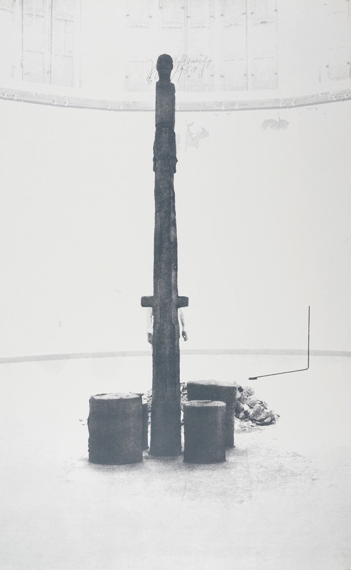 Offset da serigrafia. mm 990x630. Firmata e numerata a matita in alto al centro. Es. 60/150. Al verso, "photo by Bubi Durini" ed "Edizione Galleria Lucrezia De Domizio". Il rapporto tra Joseph Beuys e Lucrezia De Domizio nasce nel 1971; entrambi convinti che l'arte e la vita si sovrappongano e intreccino senza possibilità di delimitare i confini dell'una e dell'altra, affermano che l'arte sia, appunto, l'unica possibilità per esistere. (1) Leggere tracce d'uso marginali, ottimo stato conservativo.