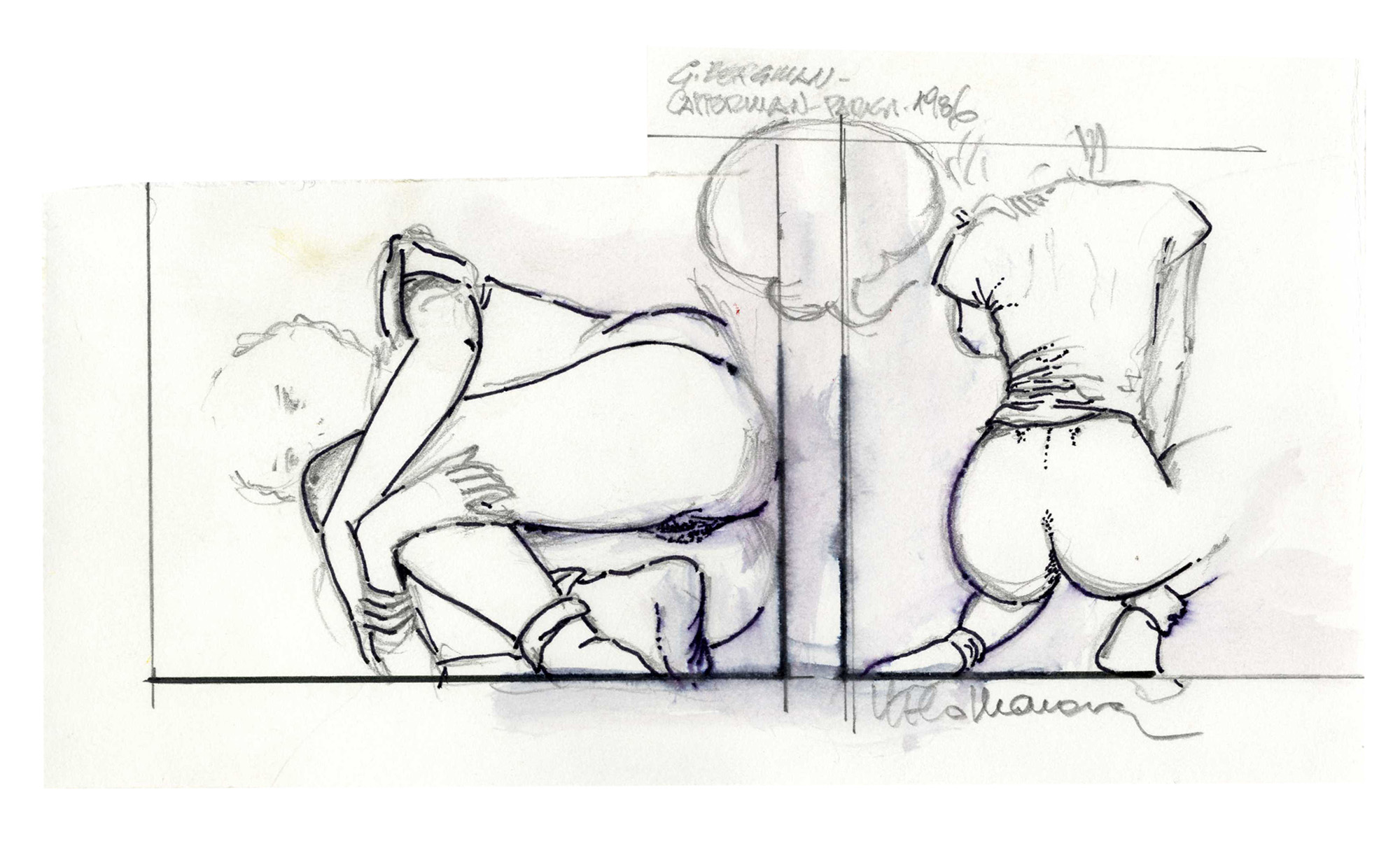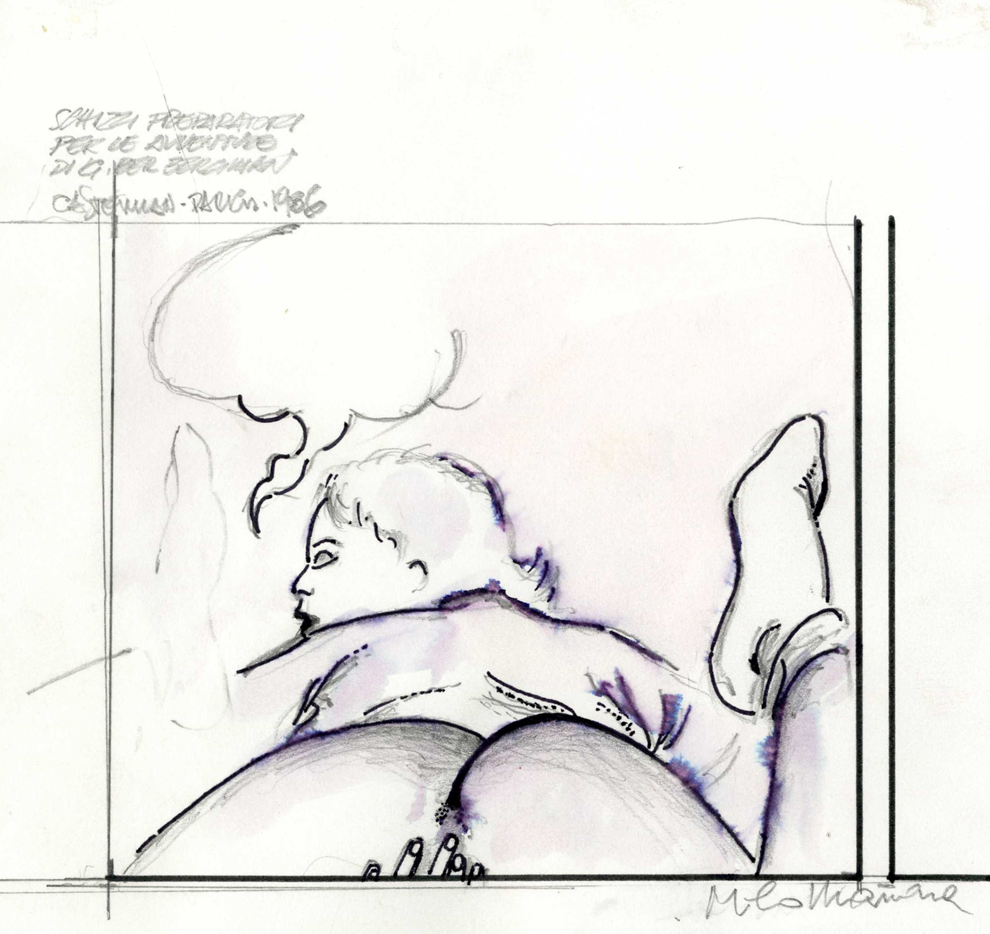 Milo Manara, Lotto composto di 2 schizzi preparatori per le avventure di Giuseppe Bergman. 1986.