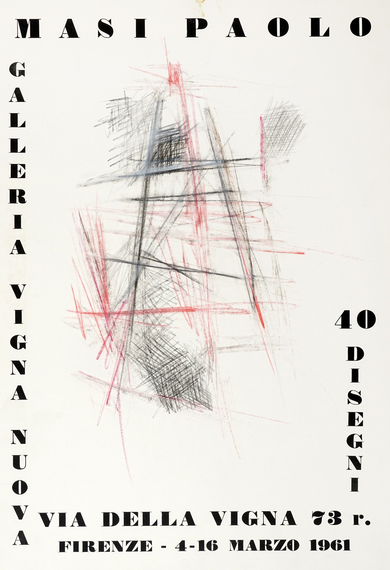Carboncino, matita e pastello grasso su locandina. mm 500x350. Locandina della mostra dell'artista presso la Galleria Vigna Nuova dal 4 al 16 marzo del 1961. (1) Tracce dei precedenti incollaggi al centro del margine superiore del verso, che si vede lievemente anche al recto. Buona conservazione.