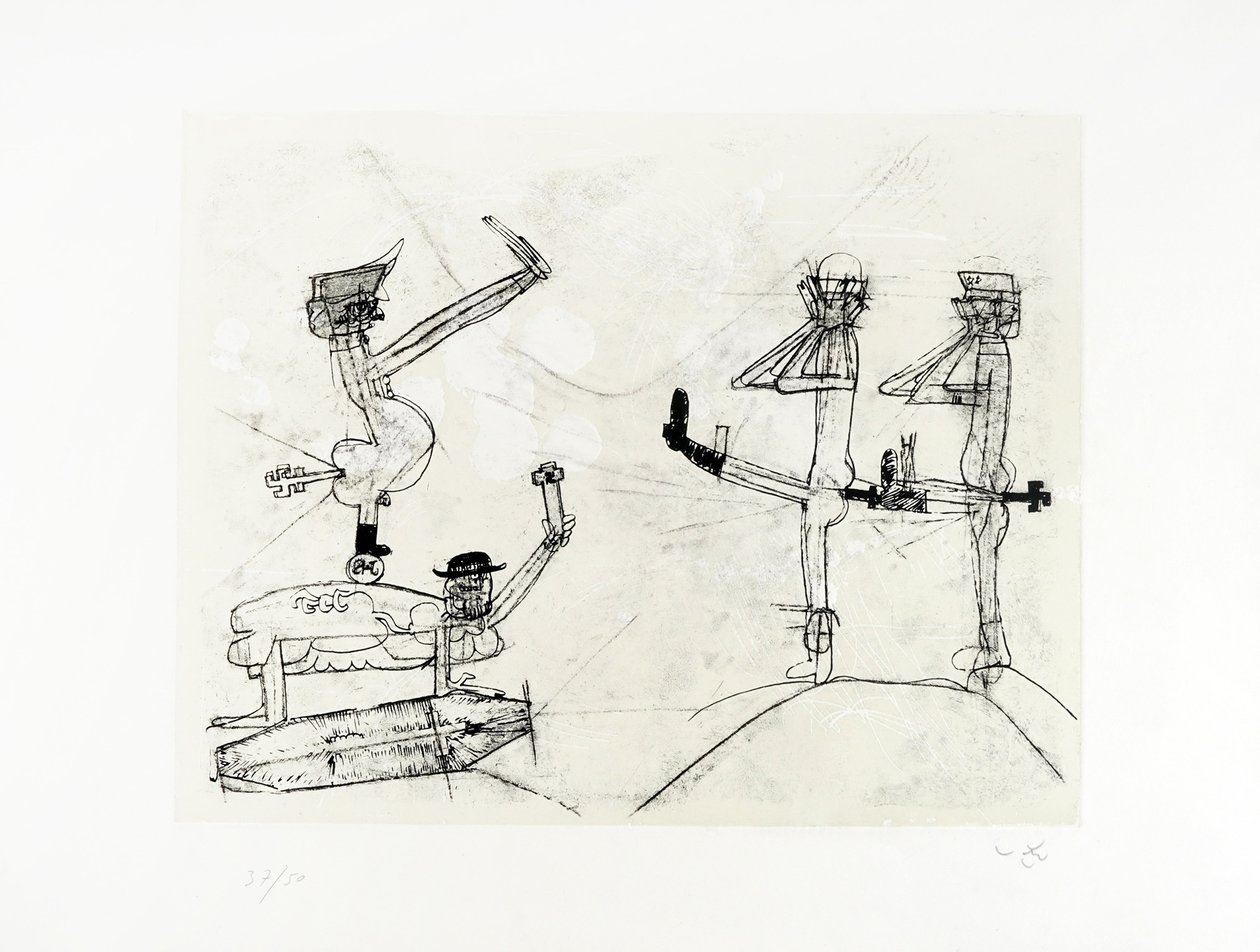 Acquatinta. mm 375x475. Foglio: mm 530x712. Firma a matita in basso a destra e tiratura in basso a sinistra. Es. 37/50. (1) Una lieve gora d'acqua all'angolo superiore sinistro e altri minimi difetti. Impressione perfetta, corposa e materica.