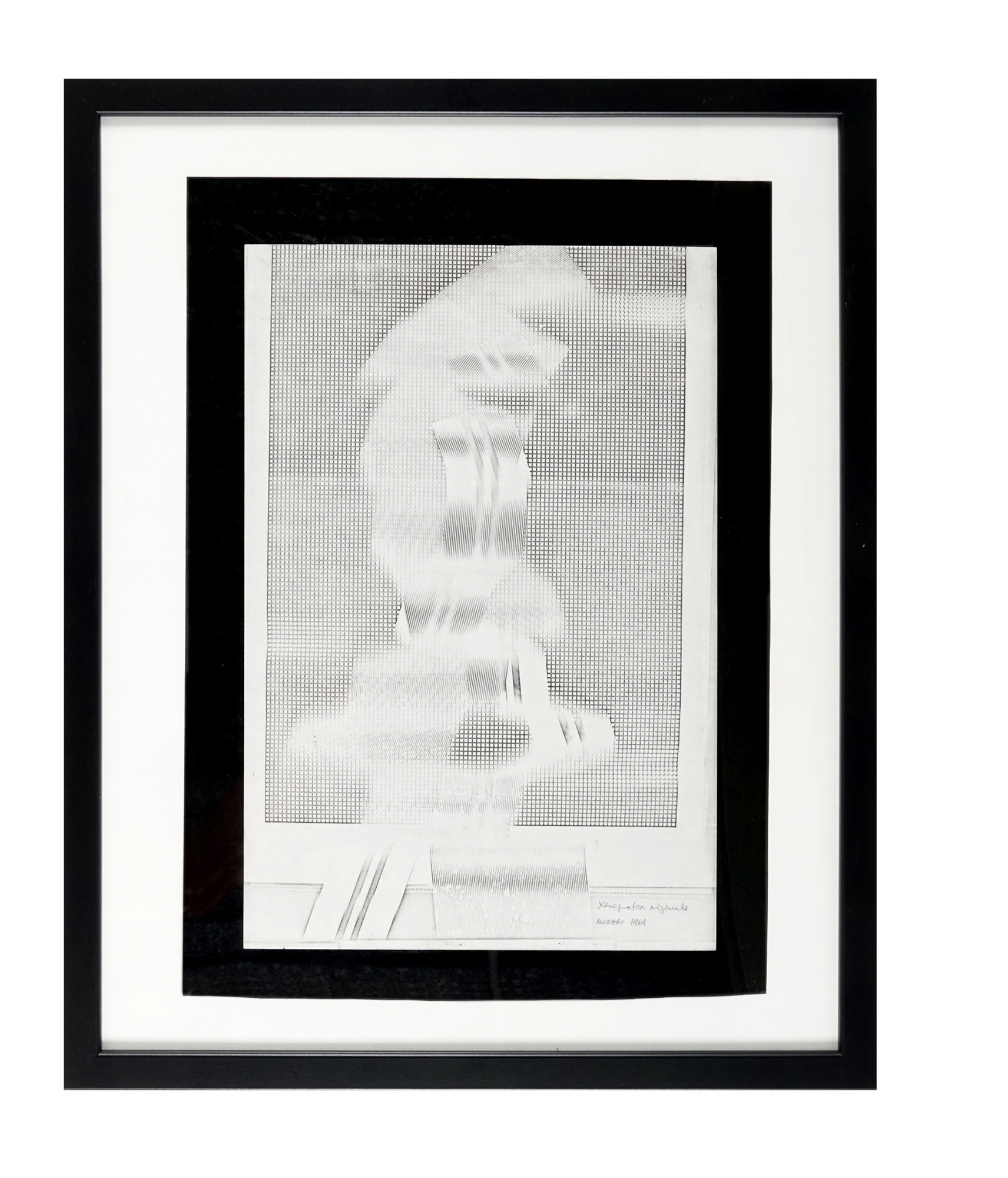 Xerografia (procedimento elettrostatico di stampa a secco). mm 370x250. Titolo, firma e data a penna a sfera nera in basso a destra. (1) In cornice nera: cm 53,5x43,5. Un invisibile strappetto al margine inferiore del foglio. Il foglio è parzialmente applicato a supporto di cartoncino nero e poi a cartone bianco.