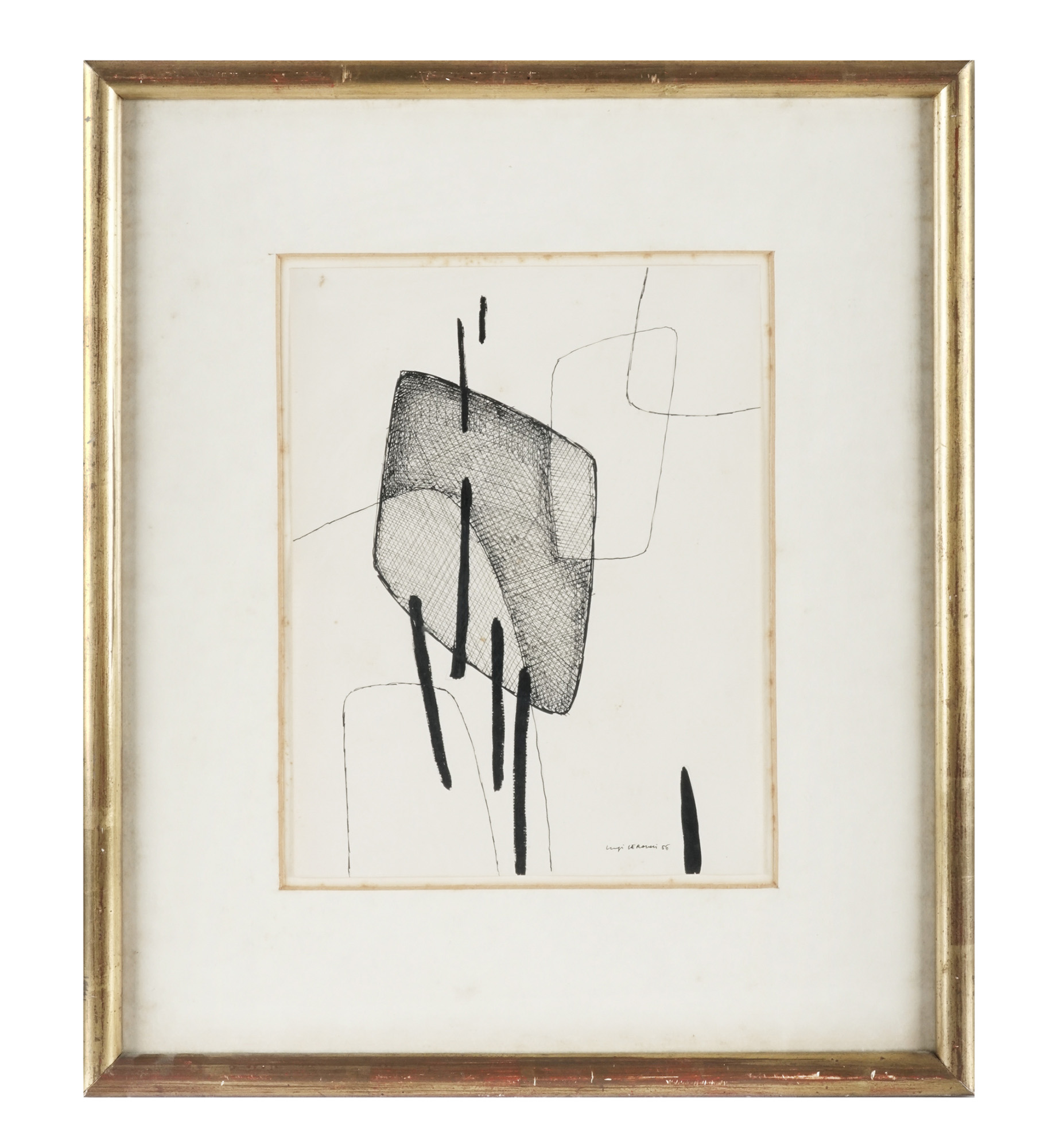 Matita, pennarello, penna e inchiostro di china su carta. mm 265x210. Firmato e datato in basso a destra. Opera accompagnata dal certificato di autenticità di Luciano Caramel e archiviata con il numero 1966/37. L'opera si vende con l'opuscolo Luigi Veronesi Documenti Martano/Due. (1) In cornice dorata con vetro: cm 46x40. Sporadiche ma lievi fioriture altrimenti ottima conservazione.