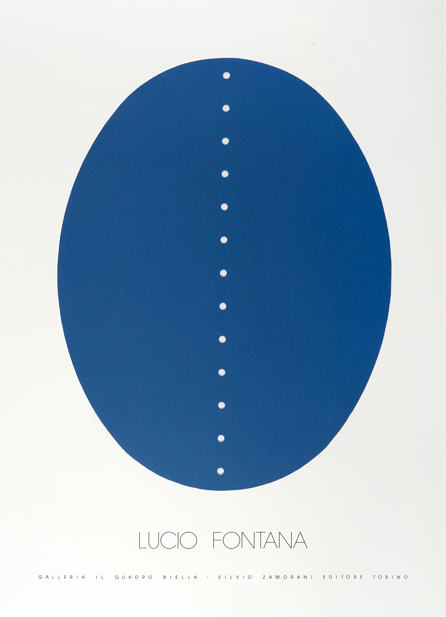Serigrafia con buchi su carta greve con filigrana BFK Rives. mm 760x560. Sotto all'ovale: "Lucio Fontana. Galleria Il Quadro Biella. Silvio Zamorani Editore Torino". (1) Ottima conservazione, opera elegante ed esemplificativa del Maestro.