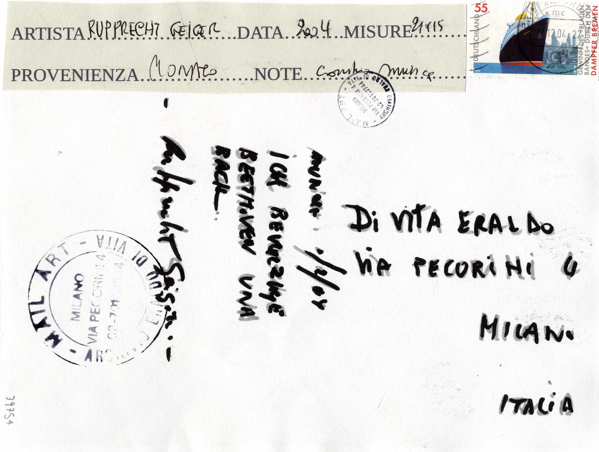 Litografia completamente dipinta a olio. mm 209x160. Al verso doppio timbro a inchiostro nero de "Mail Art - Archivio Eraldo Di Vita", iscritto l'indirizzo del critico d'arte e "Ich [...] Beethoven und Bach", con controfirma dell'artista. Targhetta applicata con i dati dell'opera e francobollo "Dampfer Bremen" con timbro. (1)