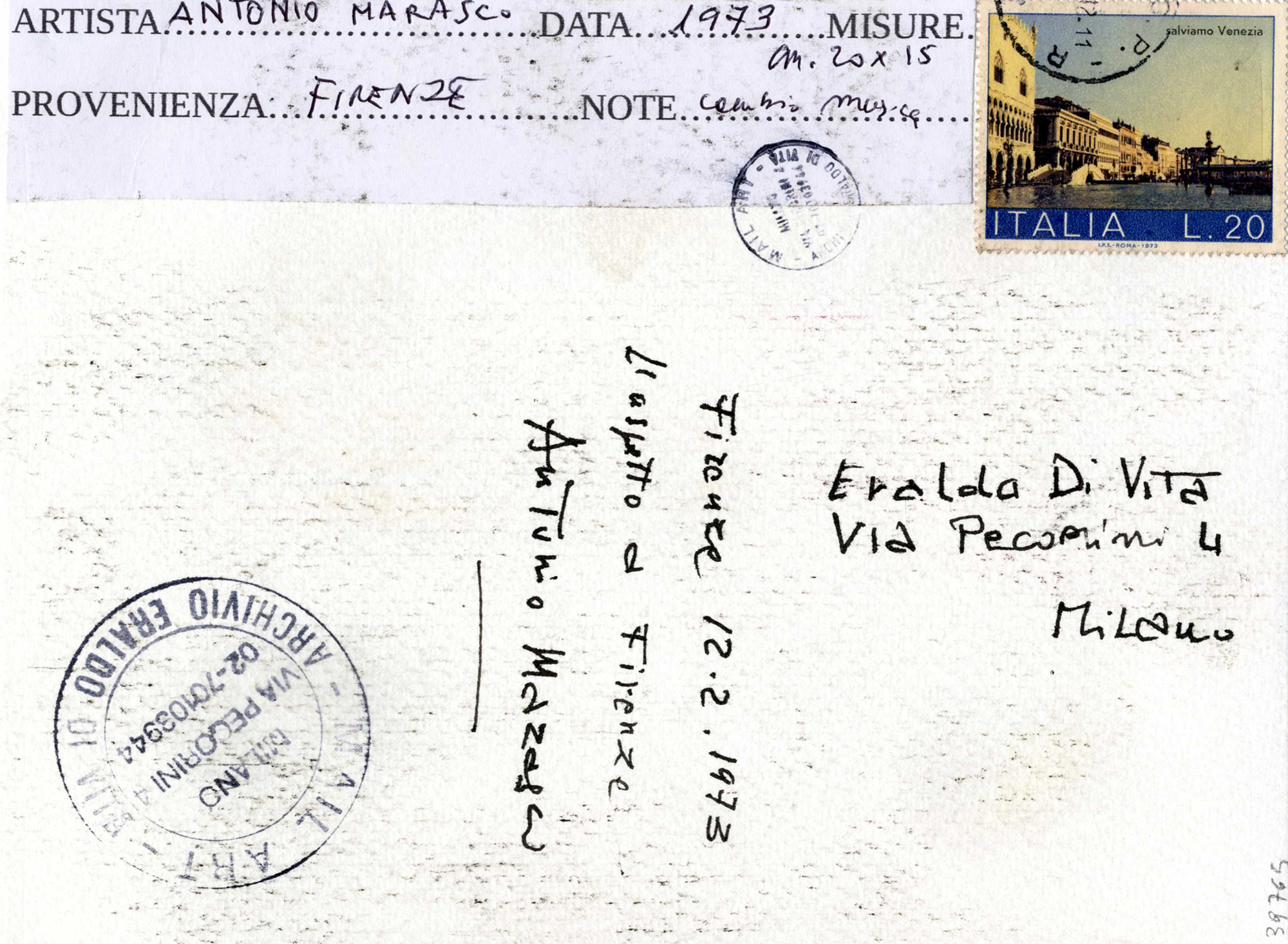Pastello grasso su cartoncino. mm 200x153. Firma e data in basso a destra. Al verso doppio timbro a inchiostro nero de "Mail Art - Archivio Eraldo Di Vita", iscritto l'indirizzo del critico d'arte e "L'aspetto a Firenze", con controfirma dell'artista. Targhetta applicata con i dati dell'opera e francobollo "Salviamo Venezia" con timbro. (1) Trascurabili tracce d'uso.