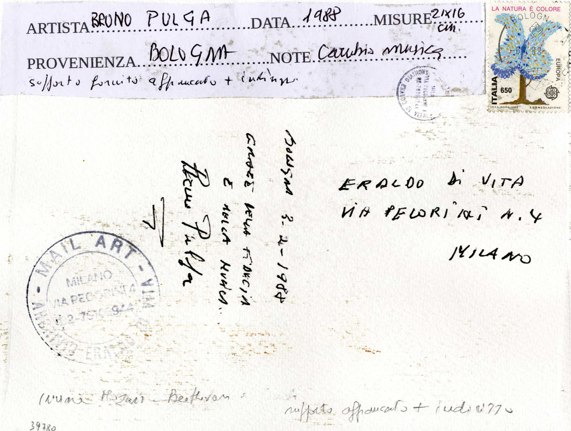 Acquerello e penne a sfera su cartoncino. mm 160x210. Firma a matita in basso al centro. Al verso doppio timbro a inchiostro nero de "Mail Art - Archivio Eraldo Di Vita", iscritto l'indirizzo del critico d'arte e "Grazie della fiducia e della musica", con controfirma dell'artista. Targhetta applicata con i dati dell'opera e francobollo "La natura è colore" con timbro. (1)
