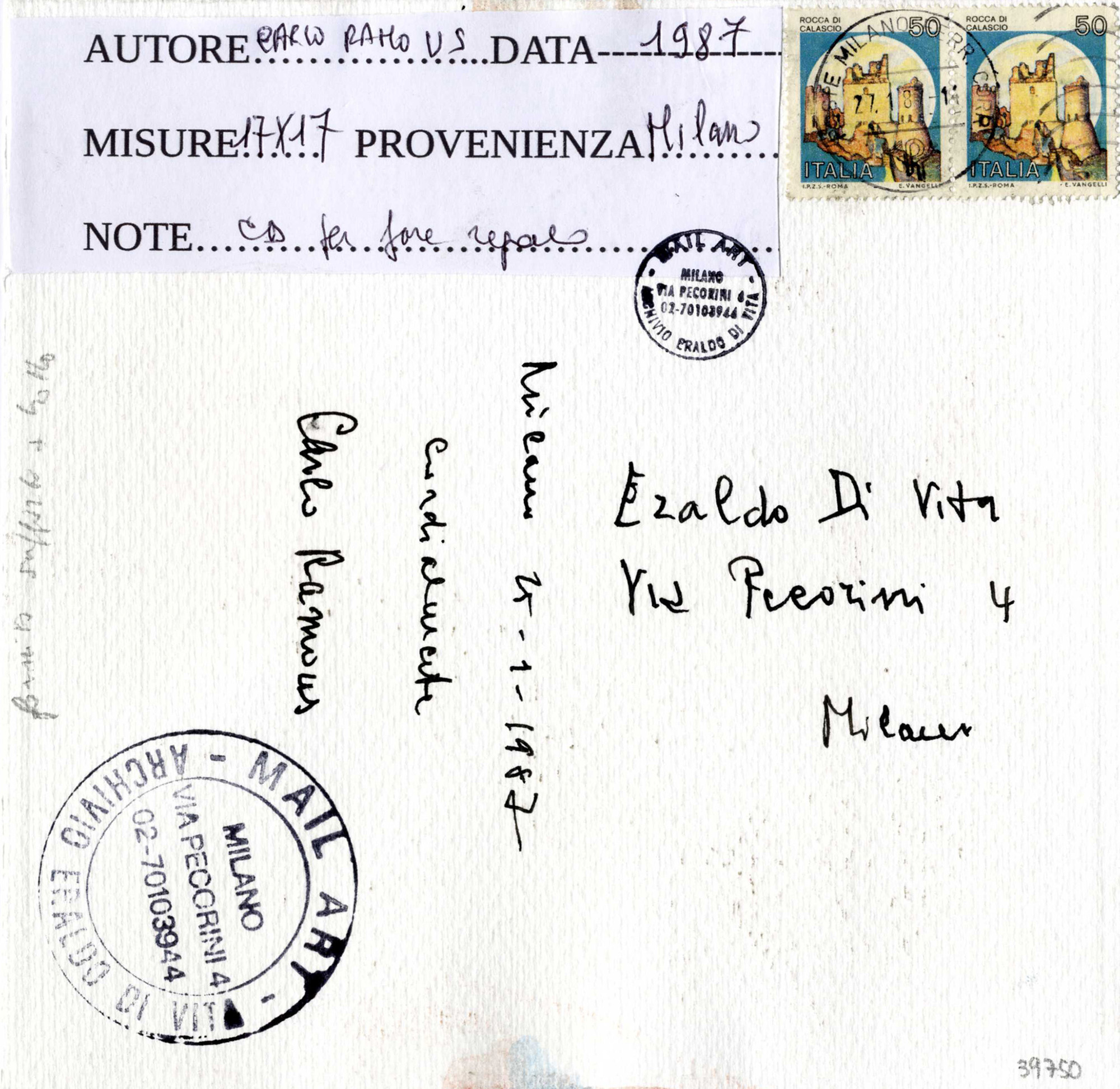 Litografia, acquerello e olio su cartoncino. mm 170x170. Firma e data a penna e inchiostro di china in basso a destra. Al verso doppio timbro a inchiostro nero de "Mail Art - Archivio Eraldo Di Vita", iscritto l'indirizzo del critico d'arte e "Cordialmente", con controfirma dell'artista. Targhetta applicata con i dati dell'opera e francobollo "Rocca di Calascio, Italia" con timbro. (1)