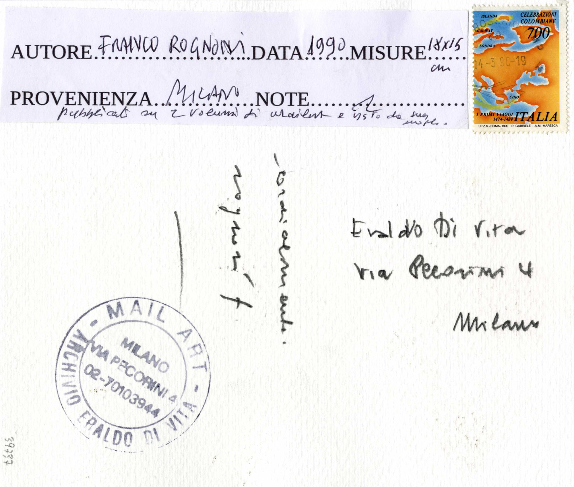 Acquerello e matita su cartoncino. mm 180x154. Firma in basso a destra. Al verso timbro a inchiostro nero de "Mail Art - Archivio Eraldo Di Vita", iscritto l'indirizzo del critico d'arte e "Cordialmente", con controfirma dell'artista. Targhetta applicata con i dati dell'opera e francobollo "Celebrazioni colombiane, Italia" con timbro. Disegno pubblicato su Mailart, uno sguardo sull'arte moderna a pag. 49. (1)
