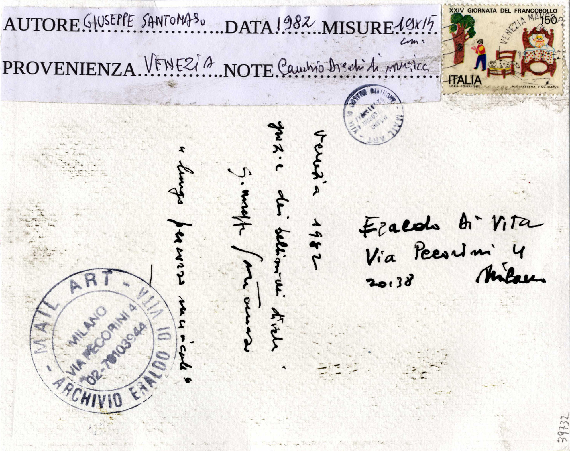 Acquerello e olio su cartoncino. mm 150x190. Firma e data a matita in basso a destra. Al verso doppio timbro a inchiostro nero de "Mail Art - Archivio Eraldo Di Vita", iscritto l'indirizzo del critico d'arte e i ringraziamenti, poi "Lungo percorso musicale", con controfirma dell'artista. Targhetta applicata con i dati dell'opera e francobollo "XXIV Giornata del Francobollo" con timbro. (1) Lievi tracce d'uso.