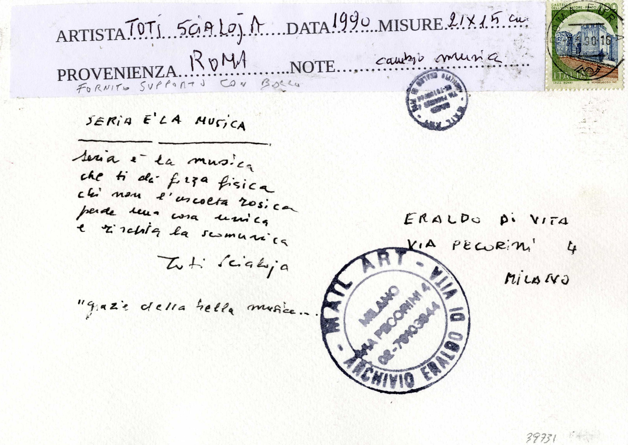 Acquerello e olio su cartoncino. mm 210x150. Firma a penna e inchiostro di china in basso a destra. Al verso doppio timbro a inchiostro nero de "Mail Art - Archivio Eraldo Di Vita", iscritto l'indirizzo del critico d'arte e "Seria è la musica. Seria è la musica/che ti dà forza fisica/chi non l'ascolta rosica/perde una cosa unica/e rischia la scomunica. Grazie della bella musica...", con controfirma dell'artista. Targhetta applicata con i dati dell'opera e francobollo "Castello dell'Imperatore, Prato" con timbro. (1)