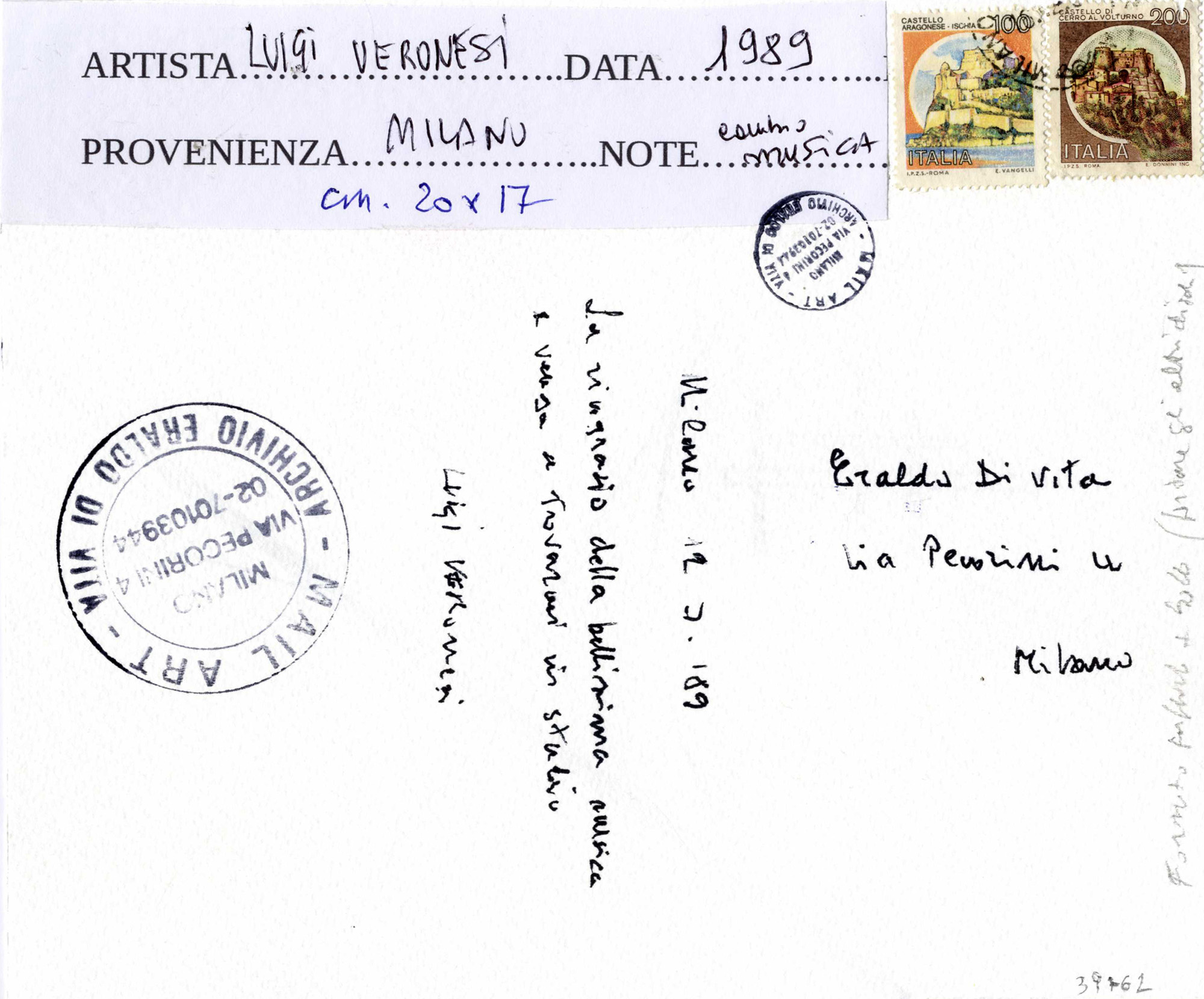 Matita, pastello, penna, pennello e inchiostro di china su cartoncino. mm 200x170. Firma e data in basso a destra. Al verso doppio timbro a inchiostro nero de "Mail Art - Archivio Eraldo Di Vita", iscritto l'indirizzo del critico d'arte e "La ringrazio della bellissima musica e venga a trovarmi in studio", con controfirma dell'artista. Targhetta applicata con i dati dell'opera e doppio francobollo "Castello Aragonese - Ischia" e "Castello di Cerro al Volturno" con timbro. (1)