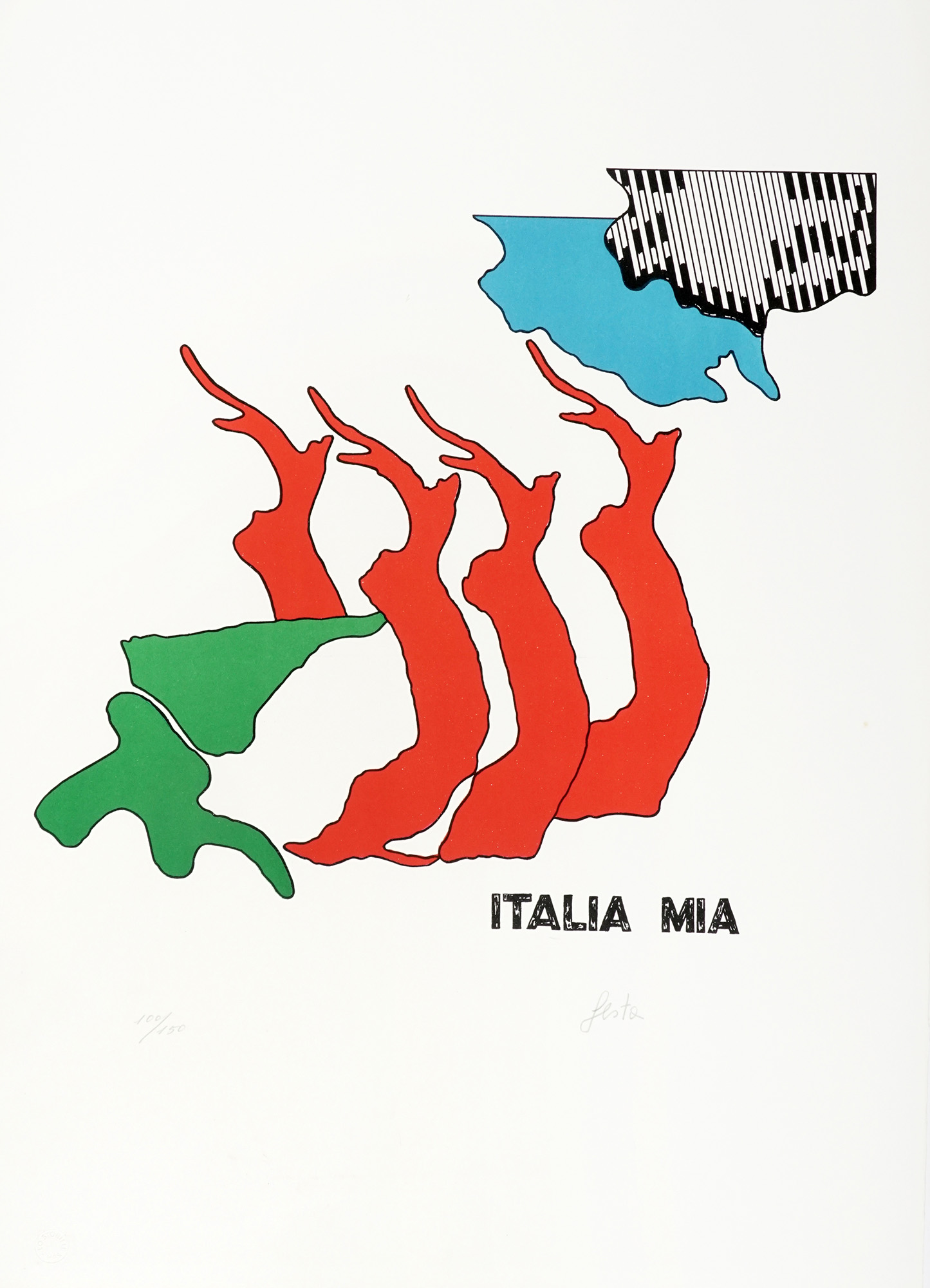 1) Dedicato a. Litografia. mm 457x420. Foglio: mm 700x500. Firma a matita in basso a destra e tiratura in basso a sinistra. Es. 29/150. 2) Italia mia. Litografia. mm 405x440. Foglio: mm 700x500. Firma a matita in basso a destra e tiratura in basso a sinistra. Es. 100/150. 3) Senza titolo. Litografia. mm 400x330. Foglio: mm 700x500. Firma a matita in basso a destra e tiratura in basso a sinistra. Es. 28/150. Tutte le incisioni hanno il timbro a secco "Lo Storiele S.P.A." in basso a sinistra. (3)