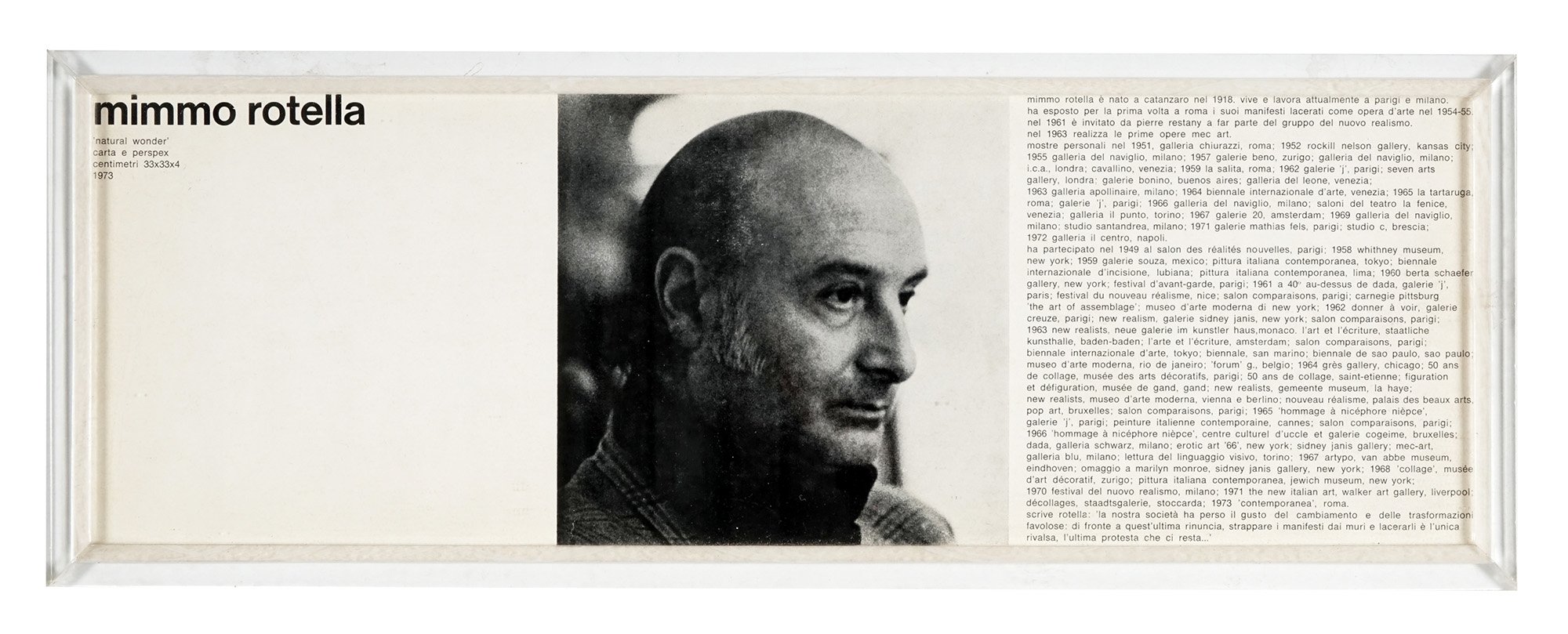 Fogli di rivista accartocciati e strappati entro teca di plexiglass. cm 33x33. Firma e data a penna a sfera nell'angolo superiore del foglio di testa e tiratura in alto a sinistra. Esemplare prodotto da Plura Edizioni, Milano. Es. 88/100. (1) Una crepa all'angolo superiore sinistro del plexiglass e pochi segni d'uso ma buona conservazione.