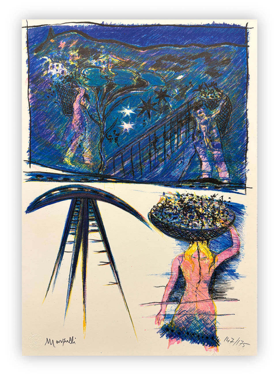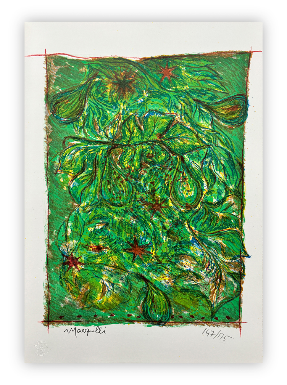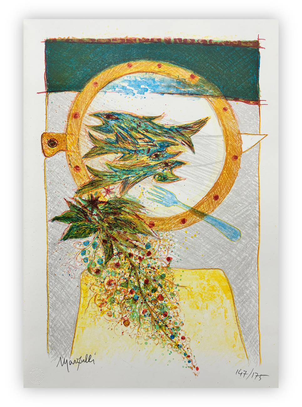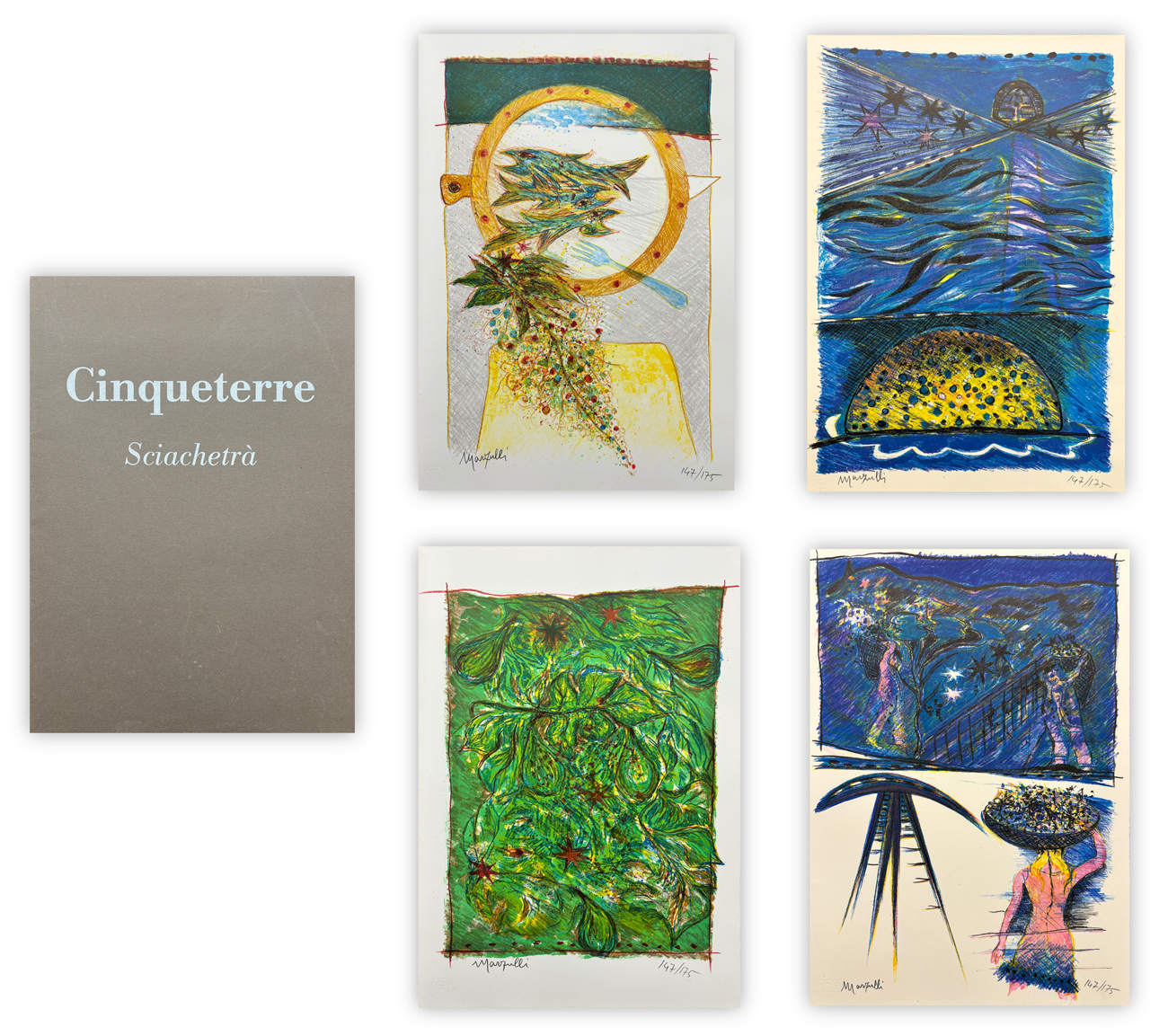 Cartella contenente 4 litografie di Lino Marzulli ciascuna recante firma e numerazione (Esemplare 147/175) a matita al fronte, con testo di Dario Cappellini