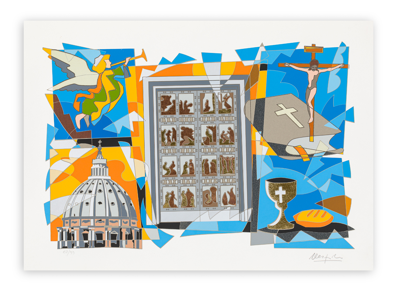 Serigrafia polimaterica con inserto a collage e con interventi in carborundum, floccaggi e passaggio calcografico a secco