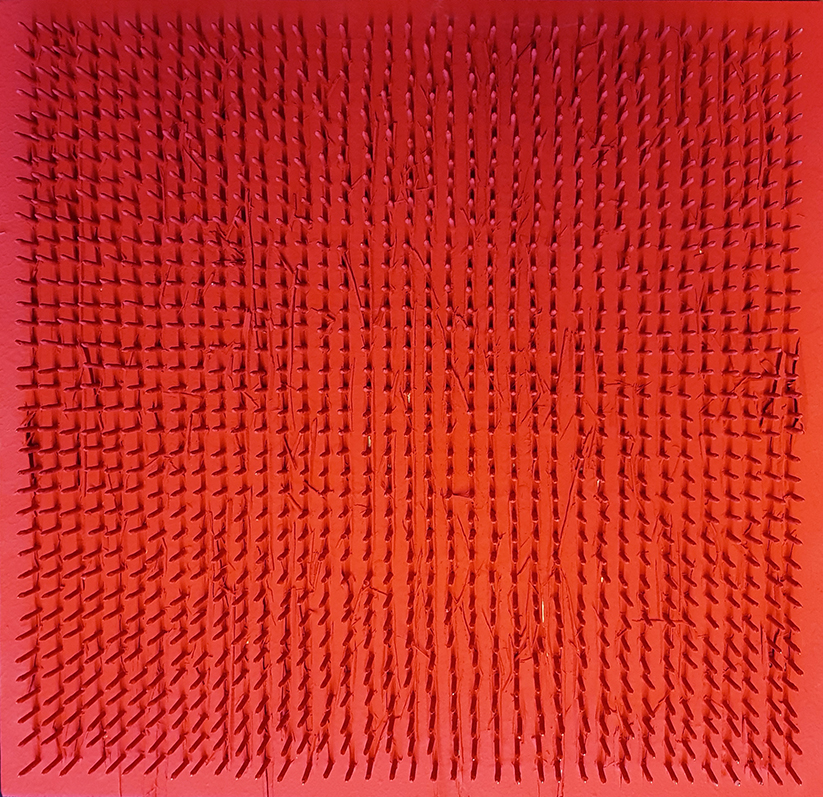 Bernard Aubertin, Chiodi su tavola, 40x40 cm, Tableau clous, 1970; Esemplare unico; Archivio Aubertin n. TCLR07-1000299523